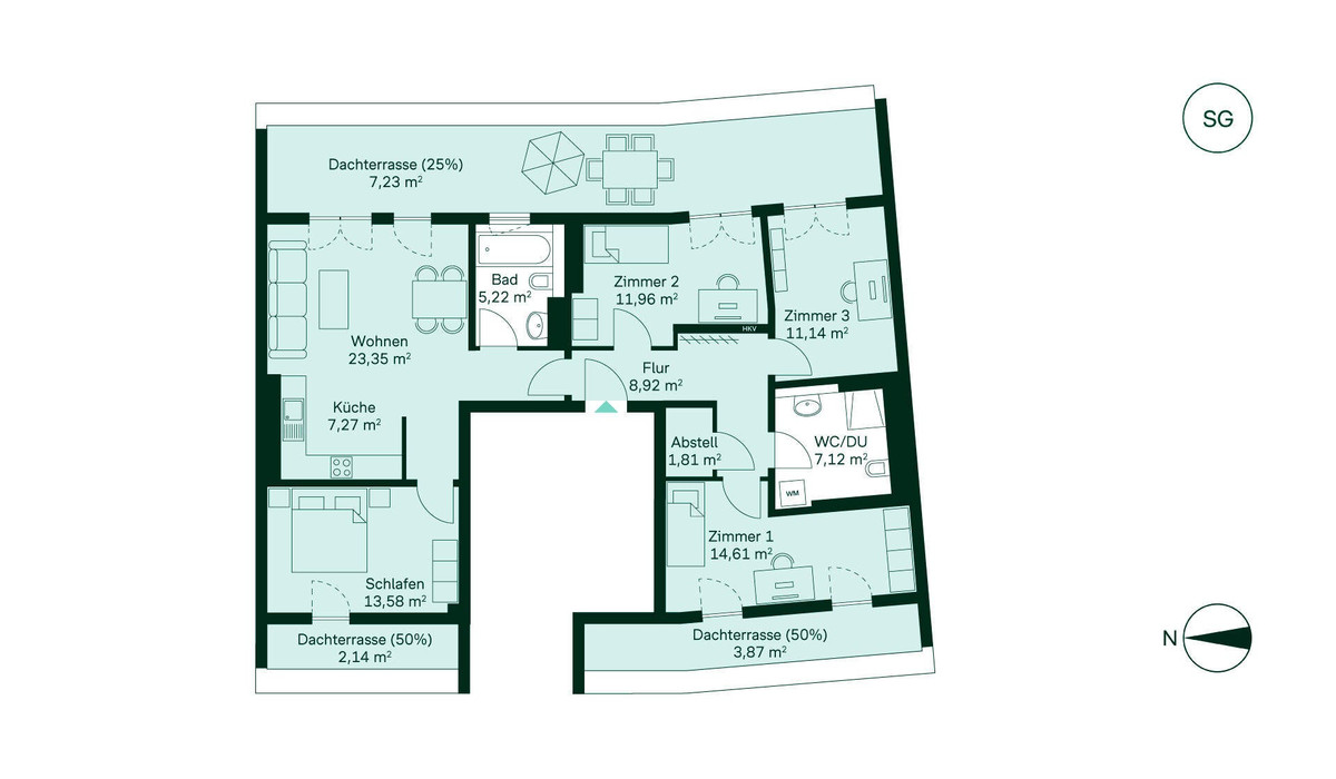 Willkommen in Ihrer neuen Eigentumswohnung im dritten Stock. Das Wohnzimmer lädt zum Entspannen ein und ist offen zur Küche gestaltet. Die drei Schlafzimmer bieten Raum für individuelle Gestaltung, ob als Kinderzimmer oder Arbeitsbereich. Zwei Badezimmer sorgen für noch mehr Komfort im Alltag. Genießen Sie die frische Luft auf einer der drei Dachterrassen. Ein praktischer Abstellraum ergänzt die Wohnung und schafft Platz für alles, was Sie benötigen.