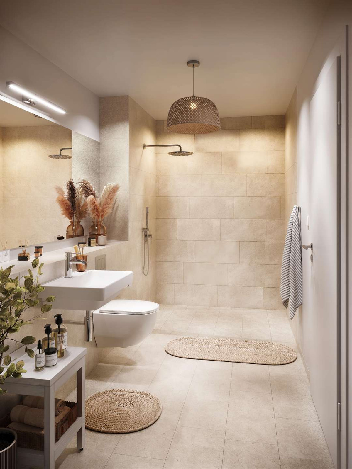 Die Ausstattung zeichnet sich durch hohe Qualität aus: Die eleganten Feinsteinzeugfliesen im Bad verleihen dem Raum eine moderne Atmosphäre. Eine separate Ankleide sorgt für Ordnung und Struktur in Ihrem neuen Zuhause.