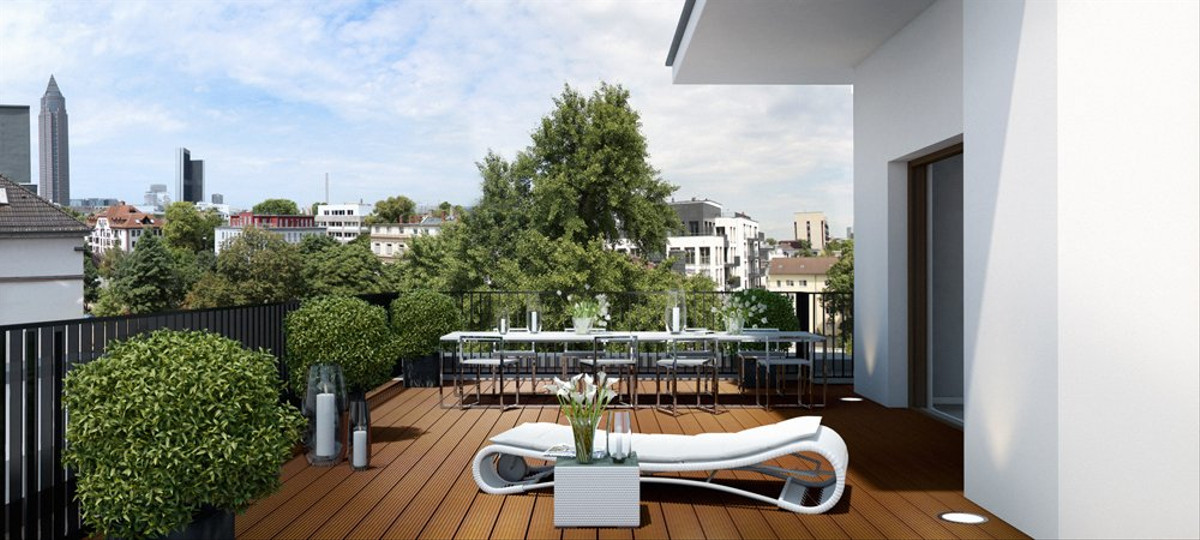 - Holzdielenbelag auf den Balkonen und Terrassen