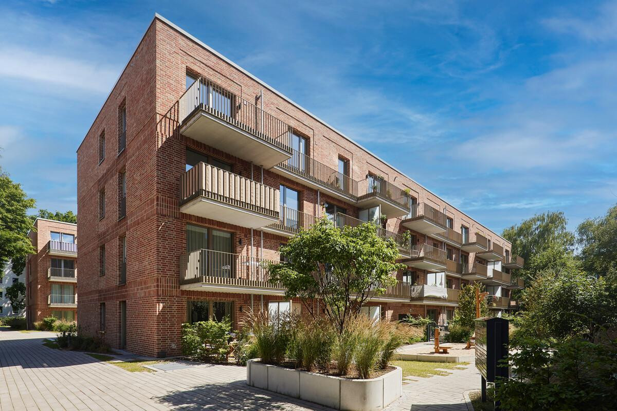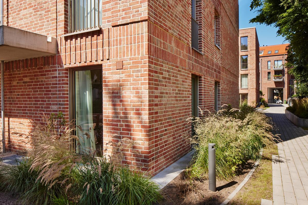 Über das elegante Vorderhaus am Stuvkamp öffnet sich der Blick in einen liebevoll gestalteten, grünen Innenhof. Zwei harmonisch proportionierte Wohnhäuser fügen sich hier in eine wohltuend ruhige Atmosphäre ein – ein geschützter Rückzugsort im Herzen von Barmbek.
