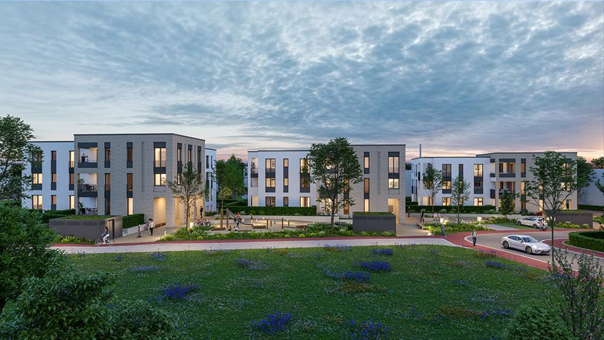 Die drei Häuser sind klar gegliedert und leicht versetzt angeordnet, wodurch großzügige Zwischenräume, Wege und Plätze entstehen. Die Erschließung erfolgt komfortabel über Aufzüge, barrierearme Zugänge und eine zentrale Tiefgarage, deren Zufahrt dezent auf der rückseitigen Grundstücksseite liegt. Durchdachte Wegeführungen verbinden die Eingänge mit den umliegenden Straßen und sorgen für kurze, gut erreichbare Wege im Alltag.