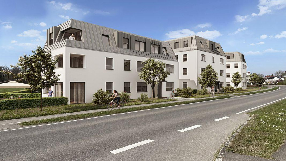In Meckenbeuren entsteht ein modernes Wohnquartier mit fünf Mehrfamilienhäusern und 49 hochwertigen Wohnungen. Die harmonische Architektur mit klassischen Putzfassaden, großen Fensterflächen und markanten Mansarddächern fügt sich perfekt in die Umgebung ein.