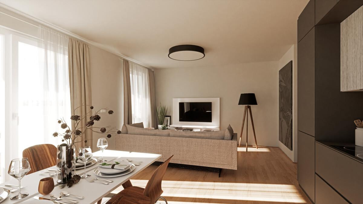 Highlight der modern ausgestatteten und lichterfüllten Wohnungen sind die großzügig dimensionierten Balkone und Terrassen mit ca. 16 bis 20 Quadratmeter. Zeitgenössische Wohnkultur versprechen offene Wohn-, Koch- und Essbereich sowie Tageslicht-Bäder mit bodengleicher Dusche oder Badewanne. Alle Wohnungen werden als Wohngesund Bauen Plus errichtet.