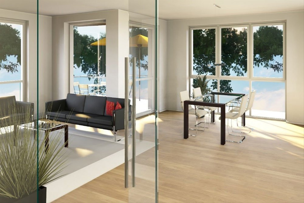 - Es werden Kunststoff-Fenster mit Wärmedämmverglasung eingesetzt. Die Beschläge als Einhand-Dreh-Kipp- oder Einhand-Dreh-Beschläge in verdeckter Ausführung. Die Fenster in den Erdgeschoss-Wohnungen und die Fenster im Bereich der Balkone im 1. Obergeschoss erhalten einbruchhemmende Beschläge.