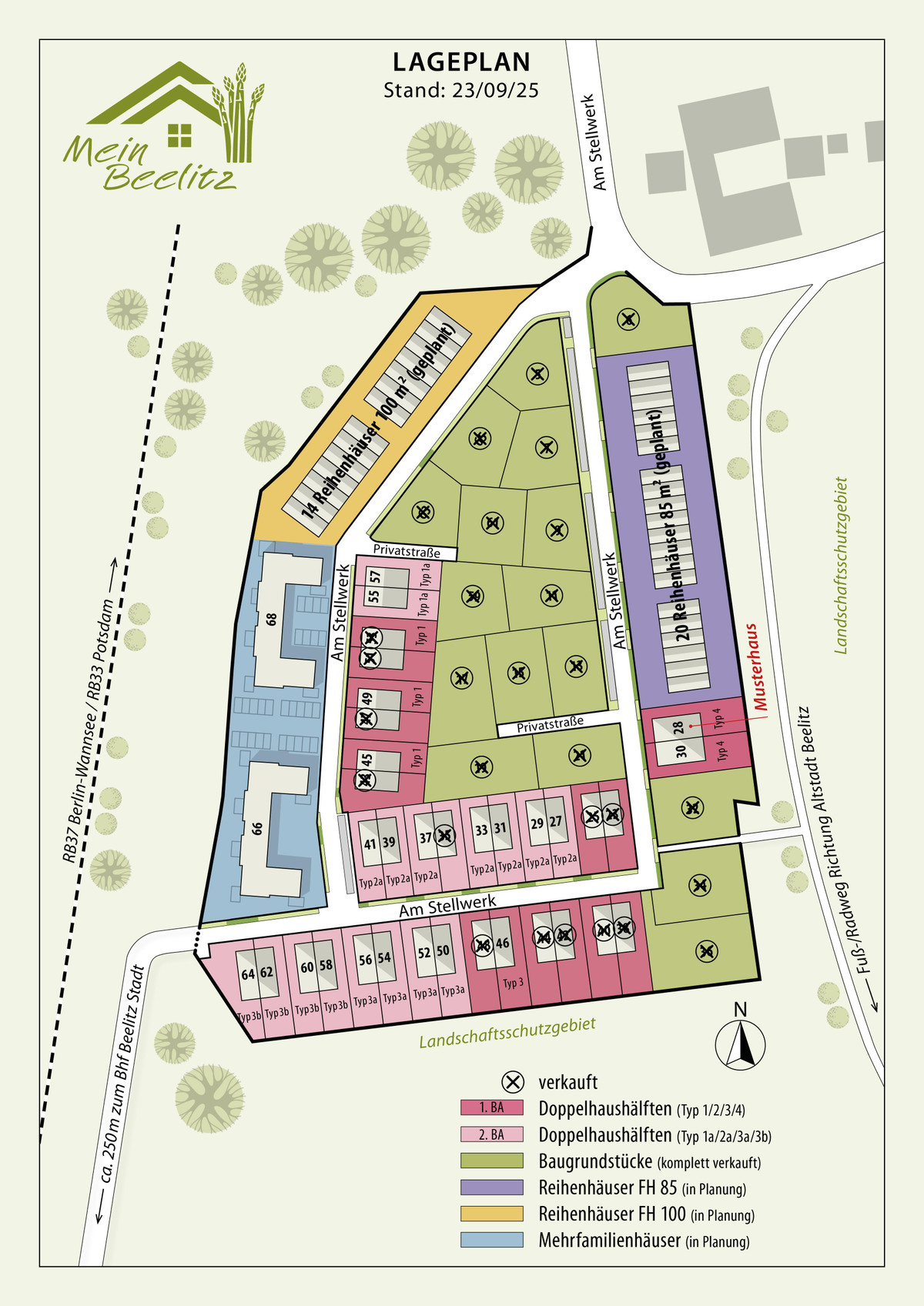 Angrenzend an ein Landschaftsschutzgebiet und fußläufig zum Bahnhof und zur Beelitzer Altstadt entsteht auf ca. 33.000 m² das familienfreundliche Wohngebiet „Mein Beelitz“ mit 34 Doppelhaushälften, 17 Baugrundstücken für freistehende Einfamilienhäuser sowie nach derzeitiger Planung Reihenhäuser und Mehrfamilienhäuser.