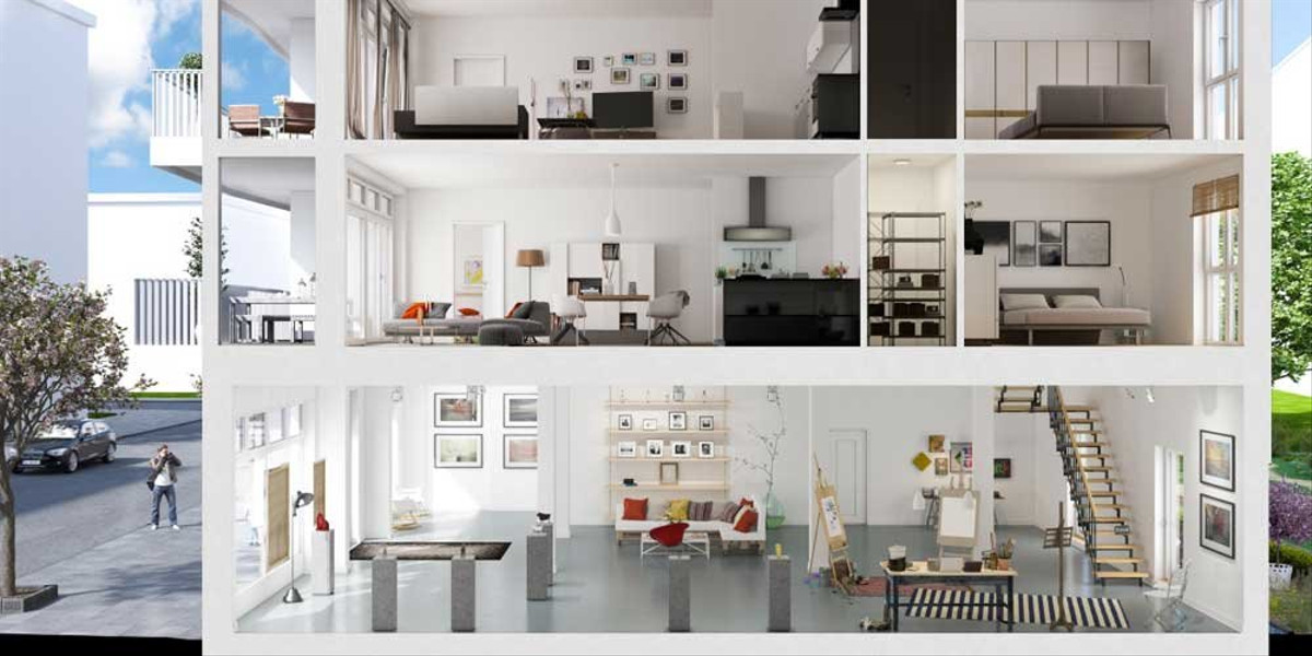 Die spannende Idee ist: Sämtliche Erdgeschossflächen lassen sich über eine Innentreppe mit der jeweils darüber liegenden Wohnung verbinden. Also Wohnen und Arbeiten unter einem Dach.