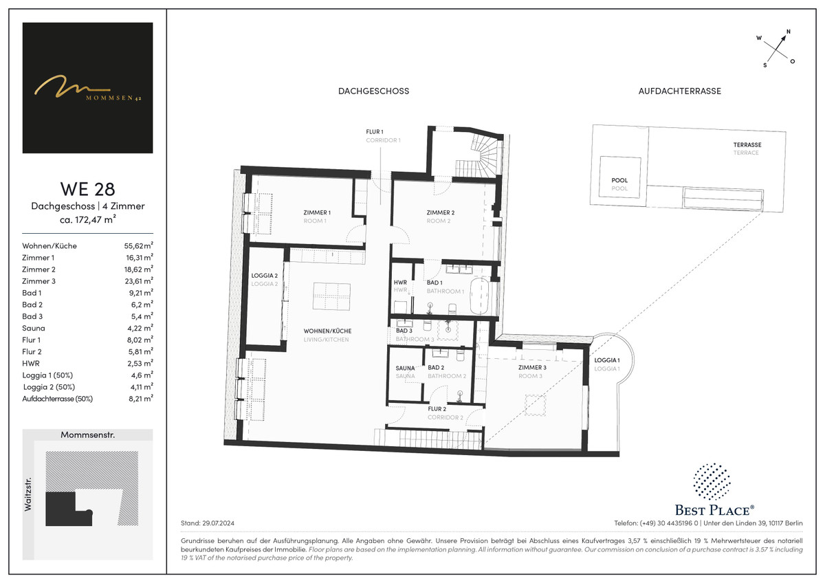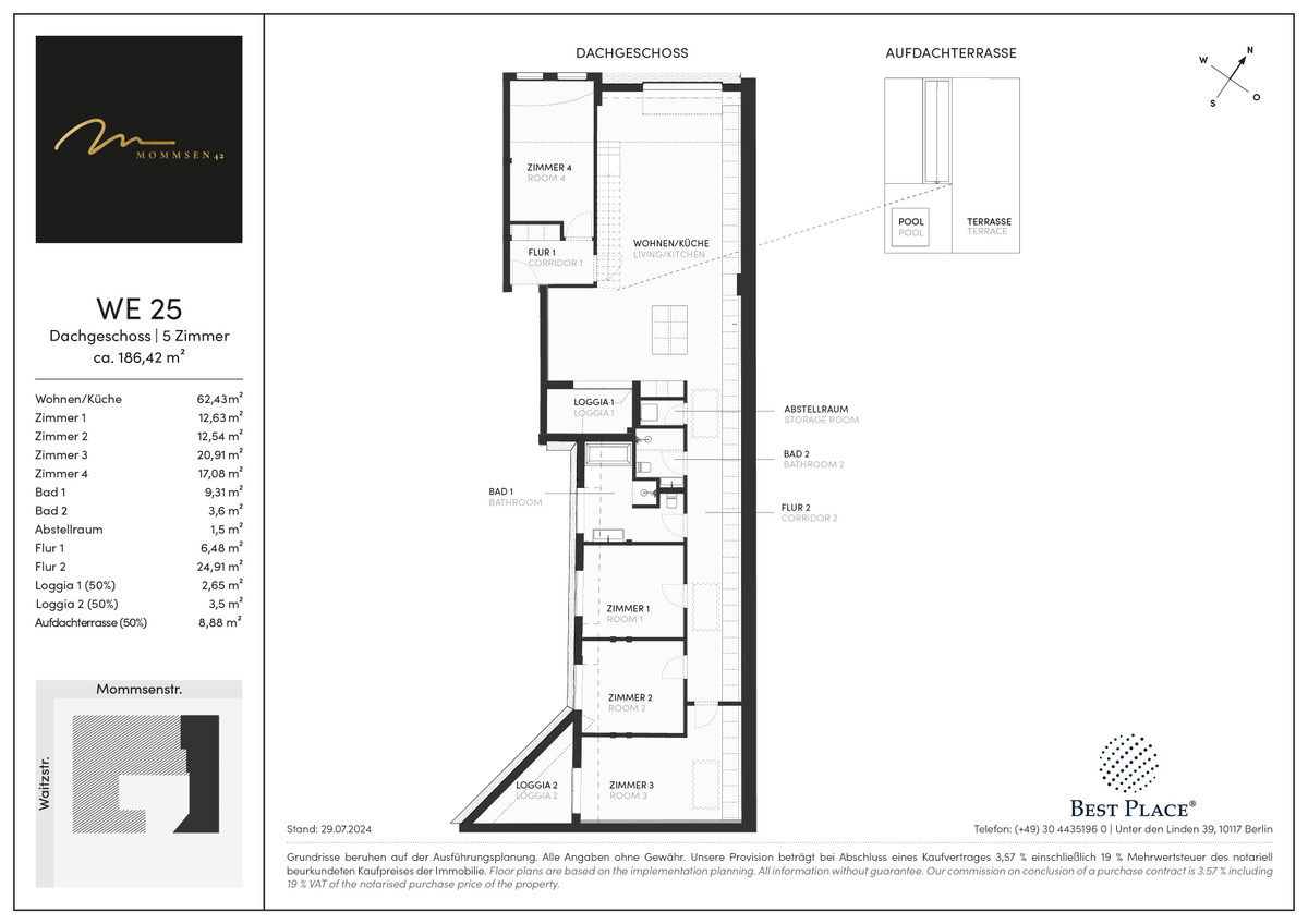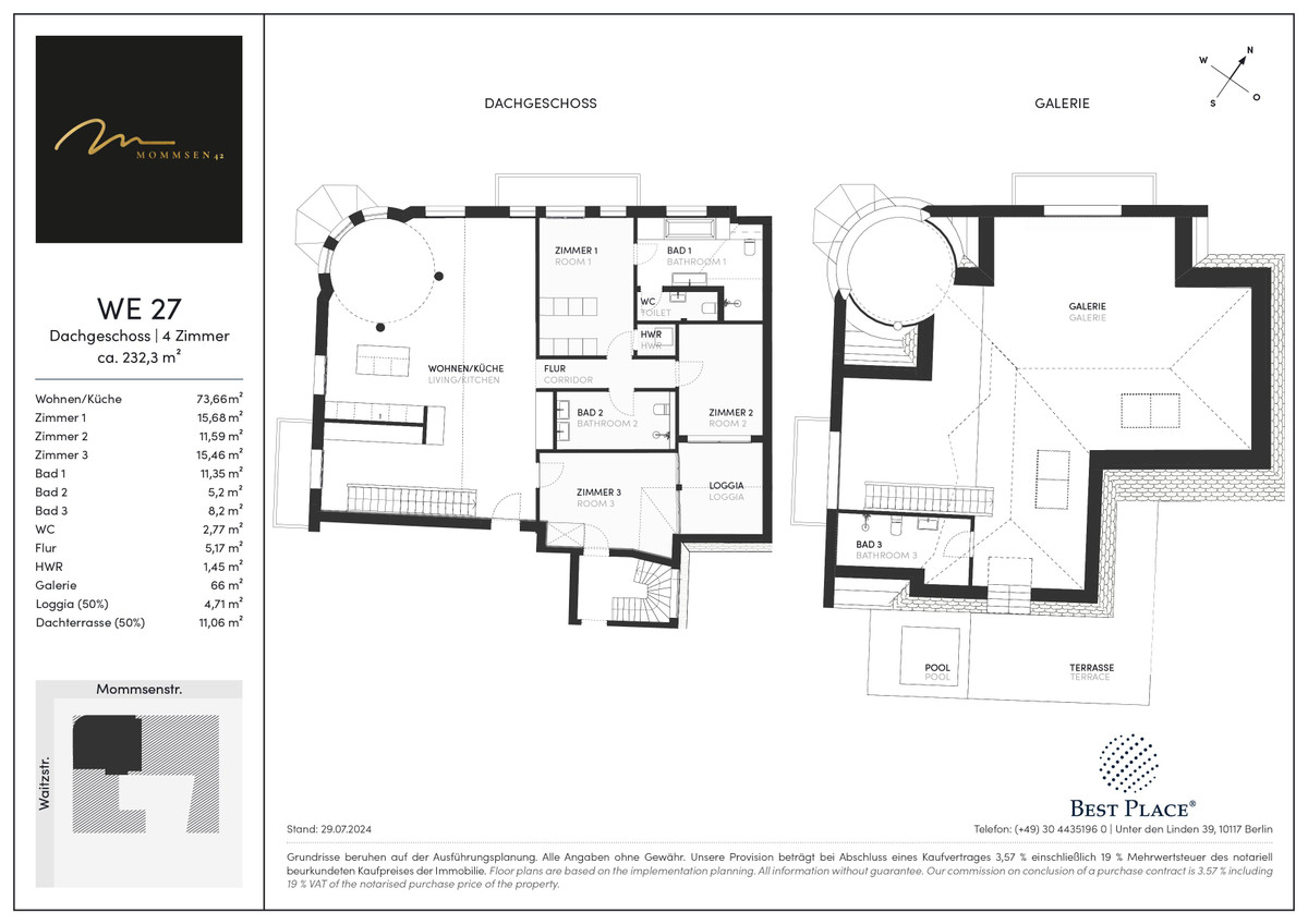 Mommsen 42 ist ein Eckwohnhaus aus dem Jahr 1905 - mit repräsentativer Fassade und historischen Elementen. Erstmals entstehen im Dachgeschoss vier exklusive Penthouses mit gehobener Ausstattung. Highlights sind die Aufdachterrassen mit 360°-Blick über die City-West.
