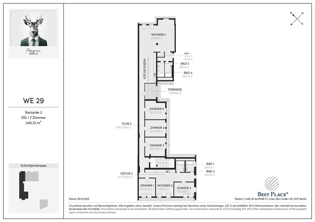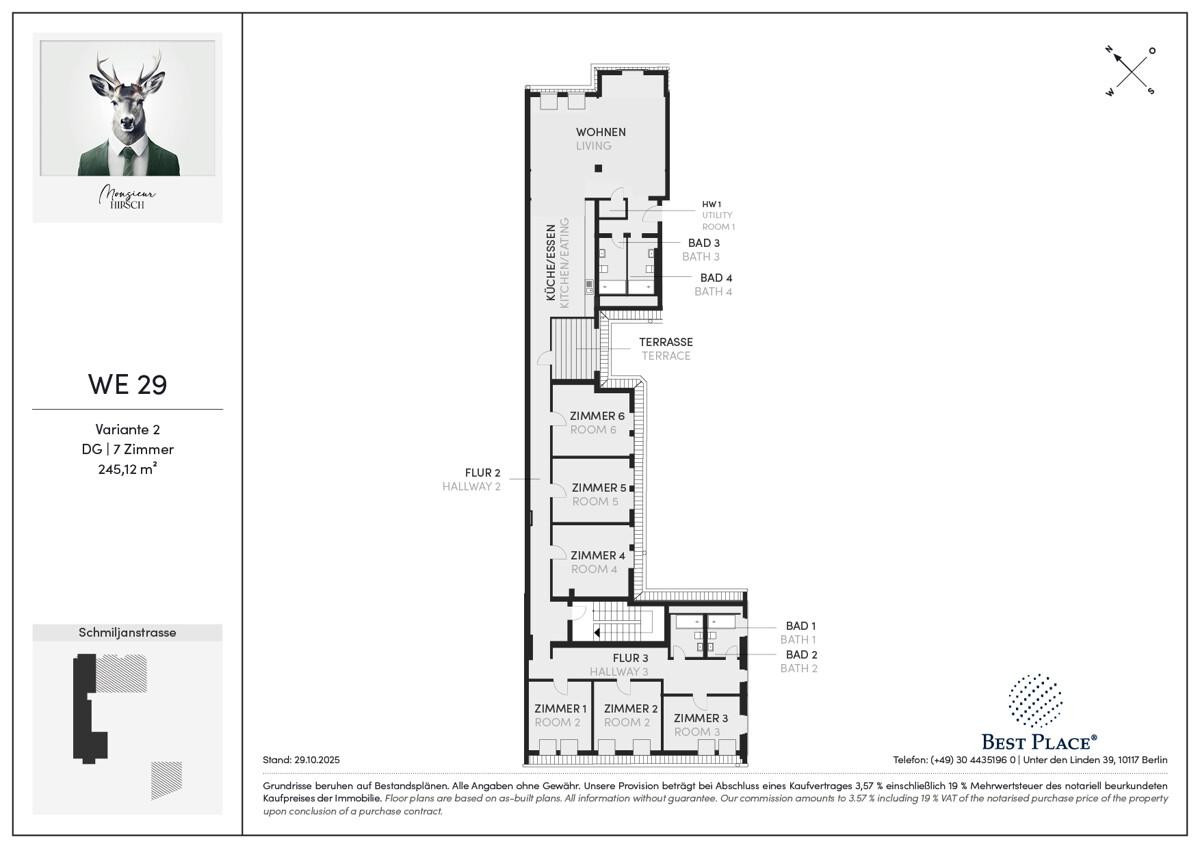 Monsieur Hirsch ist ein elegantes Gründerzeit-Ensemble mit Baujahr 1900, dessen Dachgeschoss ausgebaut wurde. Es liegt im schönen und idyllischen Friedenau im Bezirk Tempelhof-Schönberg, der zwei Hirsche in seinem Wappen führt. Die in Braun und Grün gehaltene Klinkerfassade erinnert außerdem an die Bewohner des Waldes, der mit dem Grunewald ganz in der Nähe liegt. Im Zuge des Dachgeschoss-Neubaus werden die Fassade und die Treppenhäuser renoviert und erstrahlen schon bald in neuem Glanz.