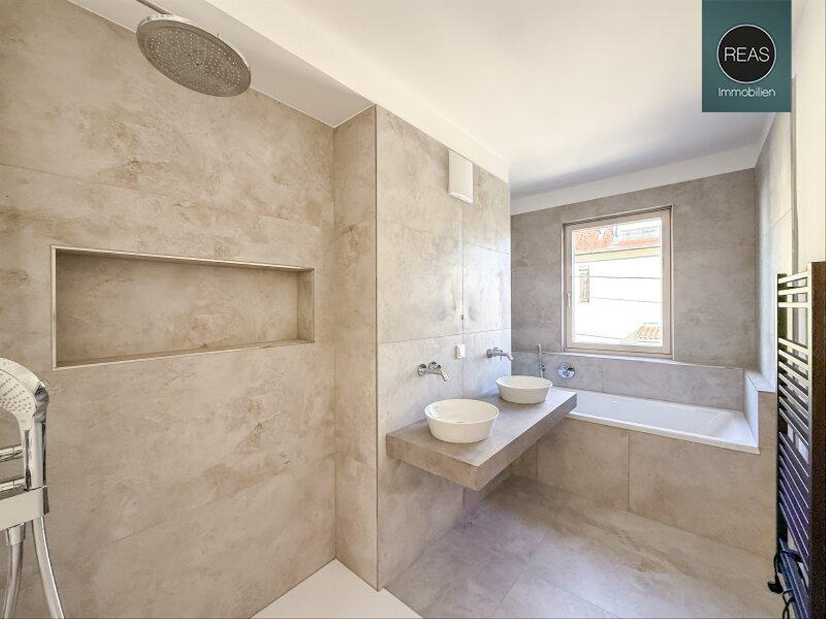 - 1 Badezimmer mit Dusche, Badewanne, Doppelwaschbecken, Handtuchheizkörper sowie einem Fenster