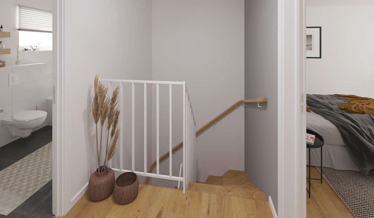 Im Obergeschoss warten drei weitere Zimmer darauf, von Ihnen als Schlaf-, Kinder- oder Gästezimmer bezogen zu werden. Ein zweites, größeres Bad mit Wanne und Dusche sorgt zudem dafür, dass stets genügend Platz für die Morgenroutine ist. Zwei Außenstellplätze stehen Ihnen ebenfalls zur Verfügung, während eine Garage optional gegen einen Aufpreis erworben werden kann.