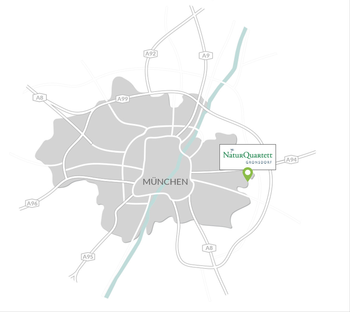 Gronsdorf liegt direkt an der Münchner Stadtgrenze zwischen Waldtrudering und der Messestadt Riem und ist mit einer eigenen S-Bahn-Station und dem U-Bahn-Halt Messestadt Ost an den ÖPNV angebunden. Der Riemer Park, ein 210 Hektar großer Landschaftspark mit Badesee, ist nur wenige Minuten zu Fuß von unserem Bauprojekt entfernt und verleiht der Gegend seinen hohen Freizeit- und Naherholungswert.