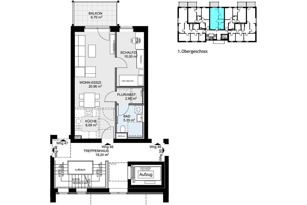 Jede Wohnung verfügt zudem über einen eigenen Kellerraum, der wie jede einzelne Wohnebene mit dem Aufzug erreicht werden kann. Die Gebäude werden nach dem KfW Standard 40 EE* errichtet. Der Anteil an erneuerbaren Energien für die Wärme- und Kälteversorgung des Gebäudes beträgt also mindestens 55 Prozent. Die vorgesehene Dachbegrünung garantiert ein gesundes Raumklima.