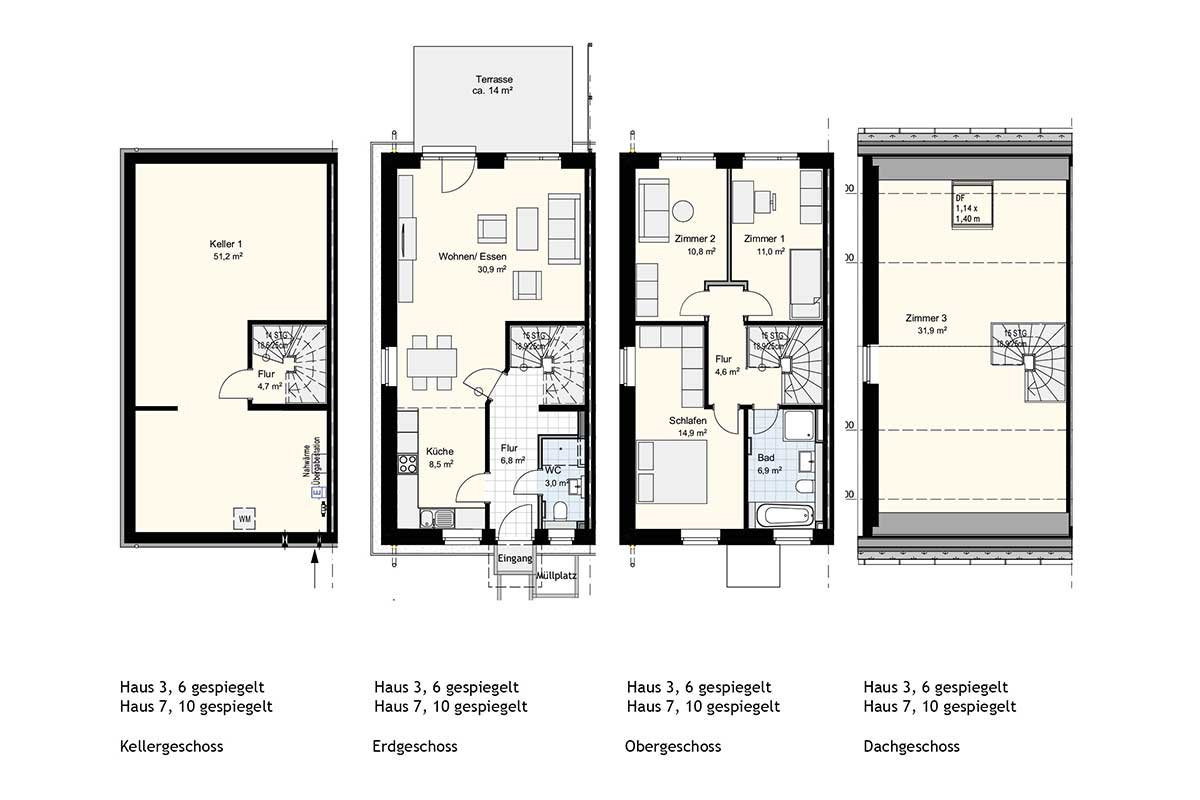 Die ersten beiden Reihenhauszeilen punkten im Erdgeschoss mit einem offen gestalteten Wohn- und Küchenbereich und einem Gäste-WC. Die bodentiefen Fenster sorgen für einen besonders hohen Lichteinfall und schaffen eine einladende Atmosphäre. Das Bad im Obergeschoss ist großzügig geschnitten und durchzogen von einem Hauch Luxus. Daneben gibt es im Obergeschoss ein Schlaf- und Ankleide- sowie Kinderzimmer. Das Highlight: in den ersten beiden Reihenhauszeilen ist das Dachgeschoss bereits für Sie ausgebaut. Das bietet jede Menge Platz für Hobbys, ein Arbeitszimmer oder zum Toben für die Kids! Auch die gedämmten und beheizten Kellerräume werden Sie ganz sicher schnell zu schätzen wissen. Die extensive Dachbegrünung sorgt für ein gesundes Mikroklima und die Fußbodenheizung in allen Wohnbereichen für ein wohlig warmes Gefühl im Inneren.