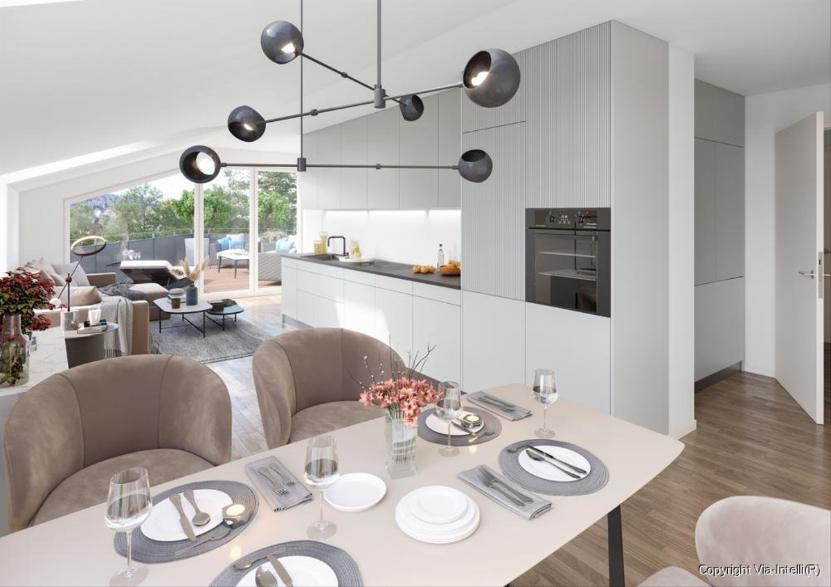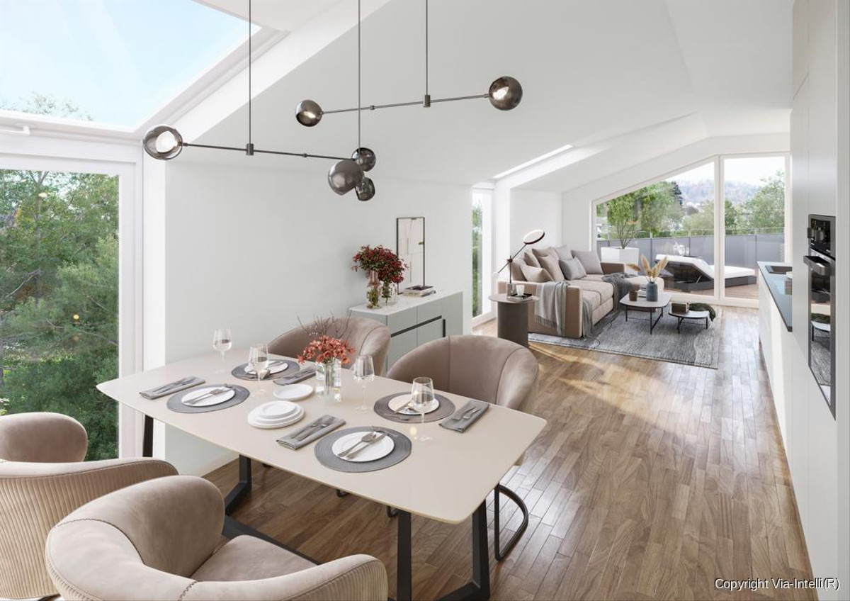 Der offene Wohnbereich ist das Herzstück der Wohnung und überzeugt mit großen Fensterfronten, die für ein helles, freundliches Ambiente sorgen. Von hier aus haben Sie direkten Zugang zur weitläufigen Dachterrasse – ein idealer Ort für sonnige Nachmittage und entspannte Abende mit Blick ins Weite.