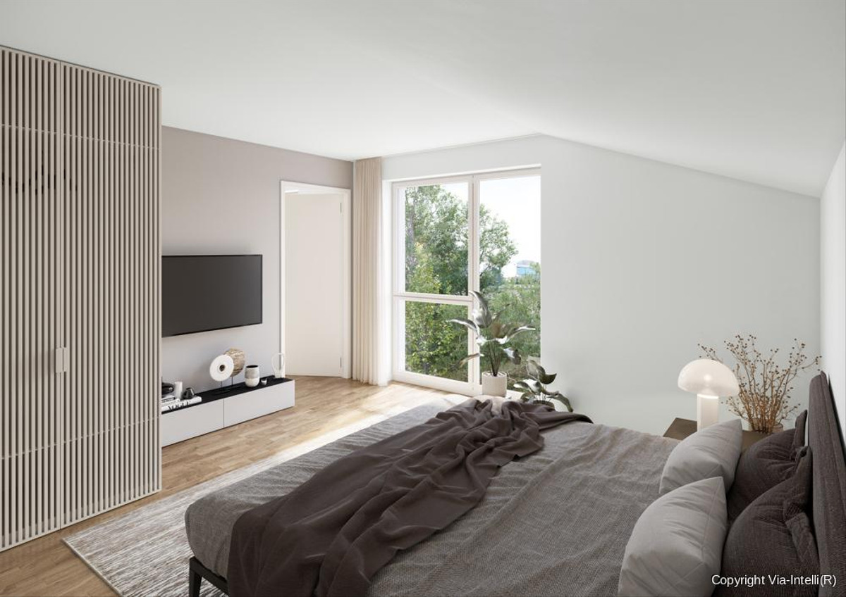 Das großzügige Schlafzimmer bietet eine angenehme Rückzugsmöglichkeit, während das angrenzende Büro ebenfalls als Ankleideraum zu nutzen ist. Ein modernes Badezimmer mit hochwertiger Walk-in-Dusche sorgt für ein exklusives Wohlfühlambiente.