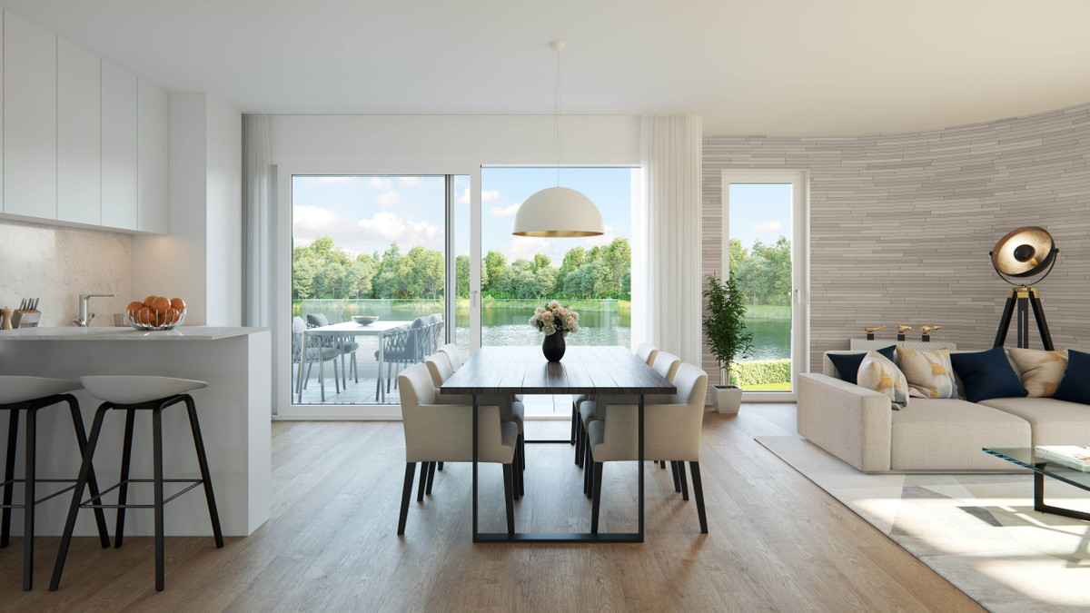In erster Reihe zum See und perfekt abgeschirmt von der Stadt im Inneren des neuen Wohnquartiers stehen die Punkthäuser mit spektakulärem Blick über den See und das Quartier. Wie auf einem Schachbrett angeordnet, schaffen sie einen spannenden Wechsel von Häusern und grünen Plätzen. Das Hauptaugenmerk bei der Gestaltung der Wohnungen war für den Architekten immer der Seeblick von den Wohnungen aus. Zurück zur Natur, zurück zur Gemeinsamkeit, zurück zur Nachbarschaft. Die perfekte Symbiose zwischen Stadtvillen und Landschaft, die anspruchsvolle Formensprache und das exklusive Lebensgefühl: All das macht PANDION ALBERTUSSEE by Hadi Teherani zu einer einzigartig begehrenswerten Adresse.