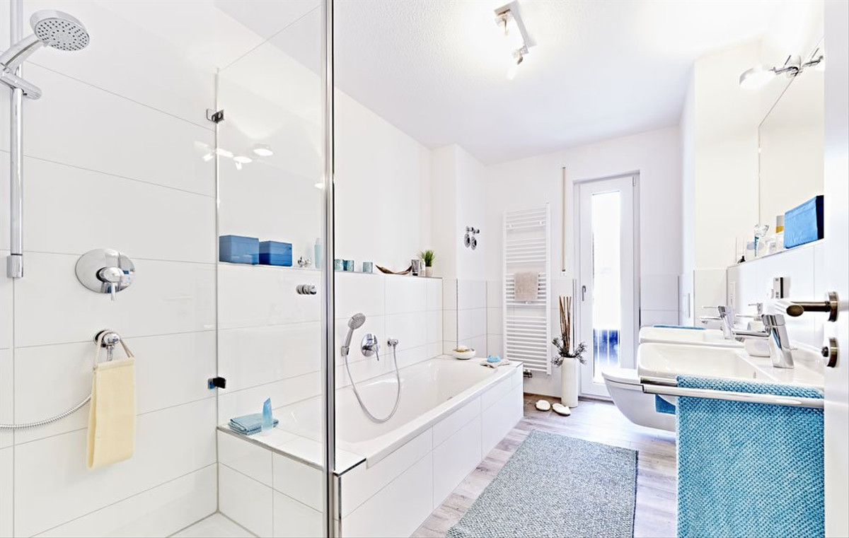 - Feinsteinzeugfliesen und Echtholzparkett zur Auswahl