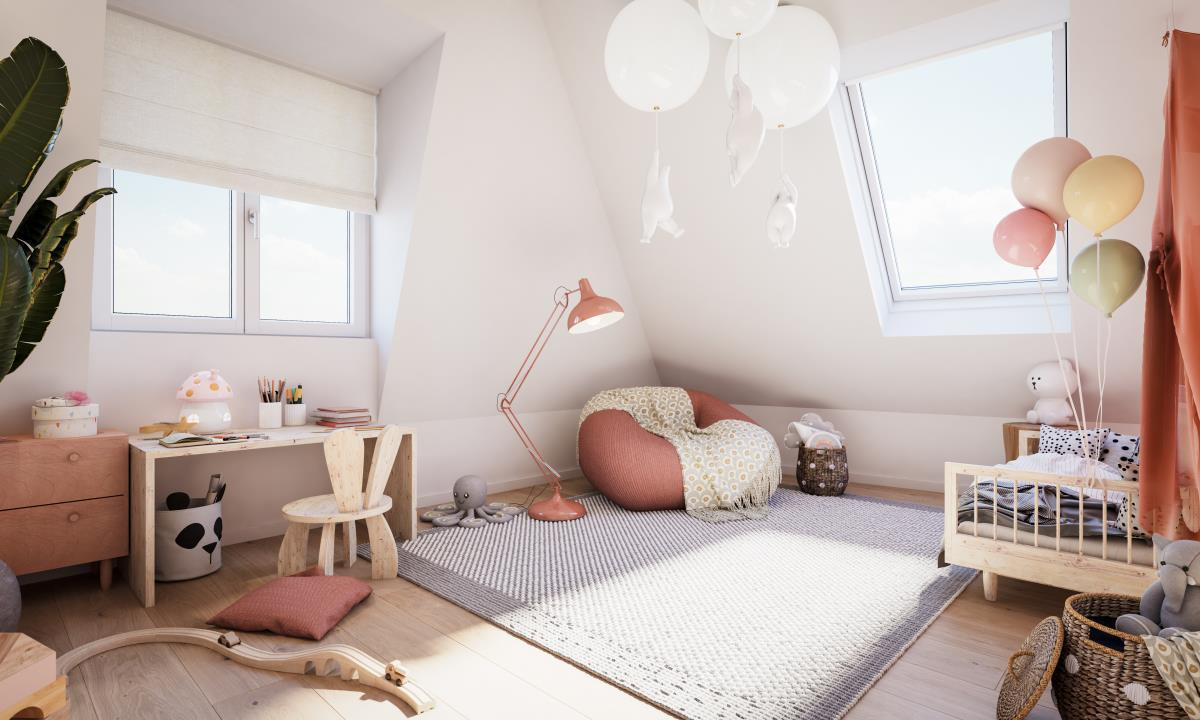 Das Dachgeschoss wartet mit zwei weiteren Zimmern, einem geräumigen, mit Wanne und Dusche ausgestatteten Tageslichtbad sowie einem Abstellraum mit Waschmaschinenanschluss auf. Das Leben auf zwei Ebenen sorgt für bequemes Wohnen mit kommunikativen Räumen und Rückzugsmöglichkeiten.