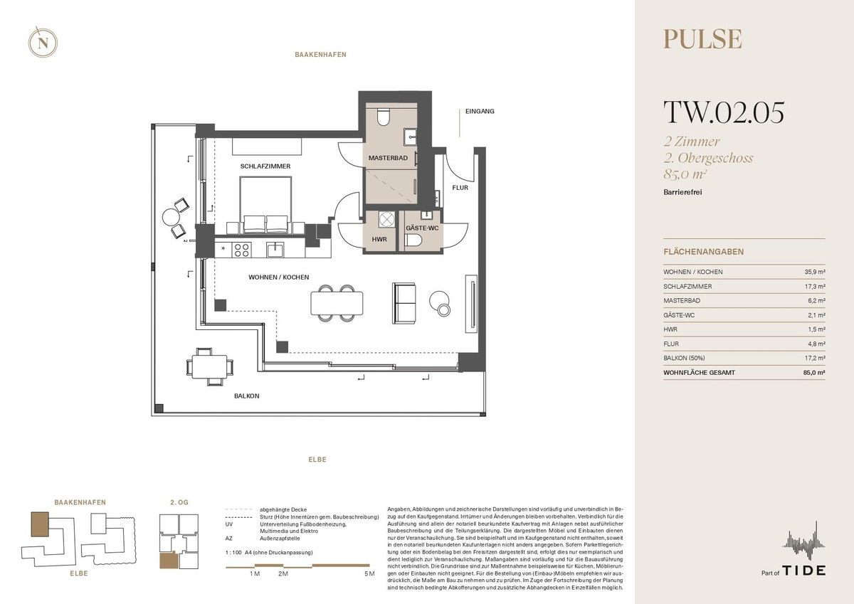 Das Gebäude umfasst insgesamt 56 exklusive Apartments und zwei Penthäuser auf 13 Wohngeschossen und bietet seinen Bewohnern ein einzigartiges Wohnambiente auf einer Halbinsel im Baakenhafen.