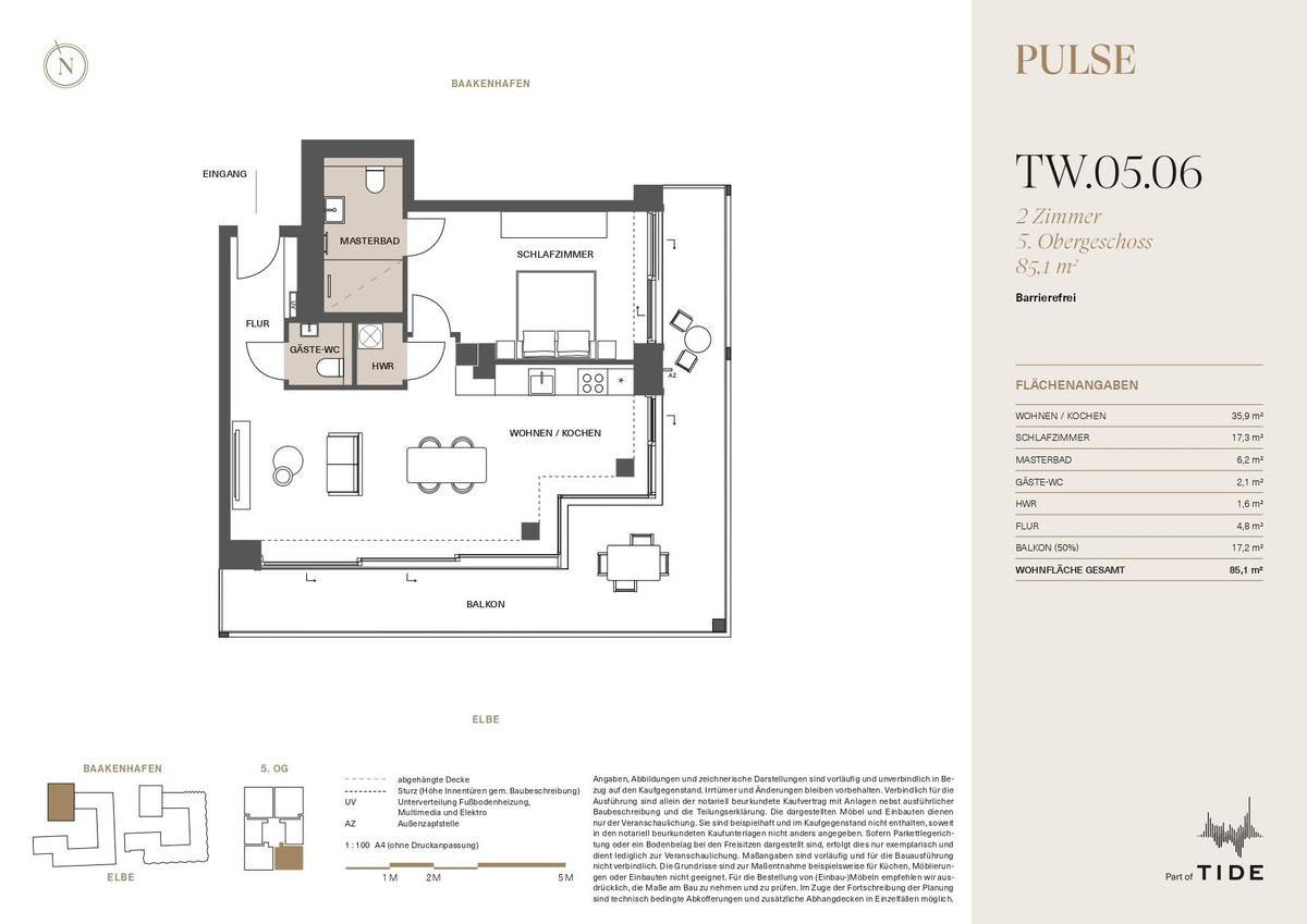 Das Gebäude umfasst insgesamt 56 exklusive Apartments und zwei Penthäuser auf 13 Wohngeschossen und bietet seinen Bewohnern ein einzigartiges Wohnambiente auf einer Halbinsel im Baakenhafen.
