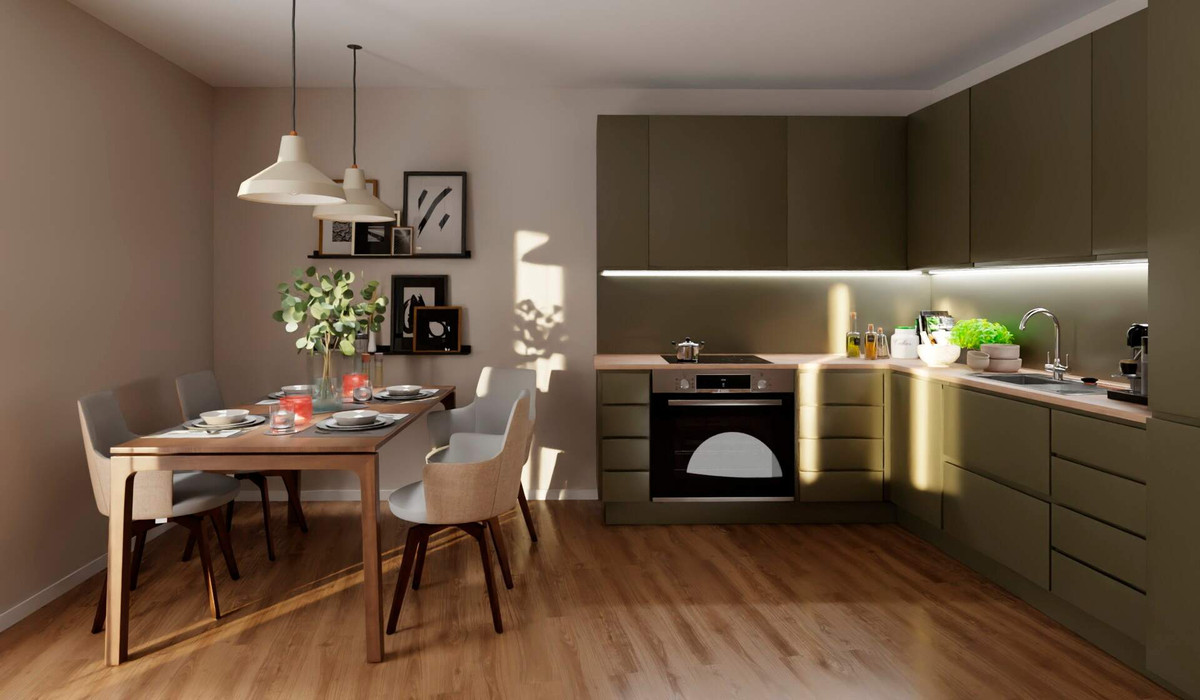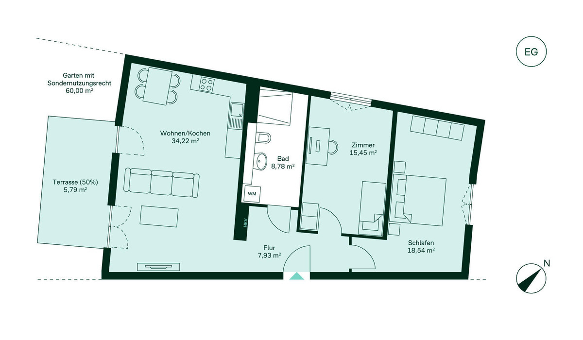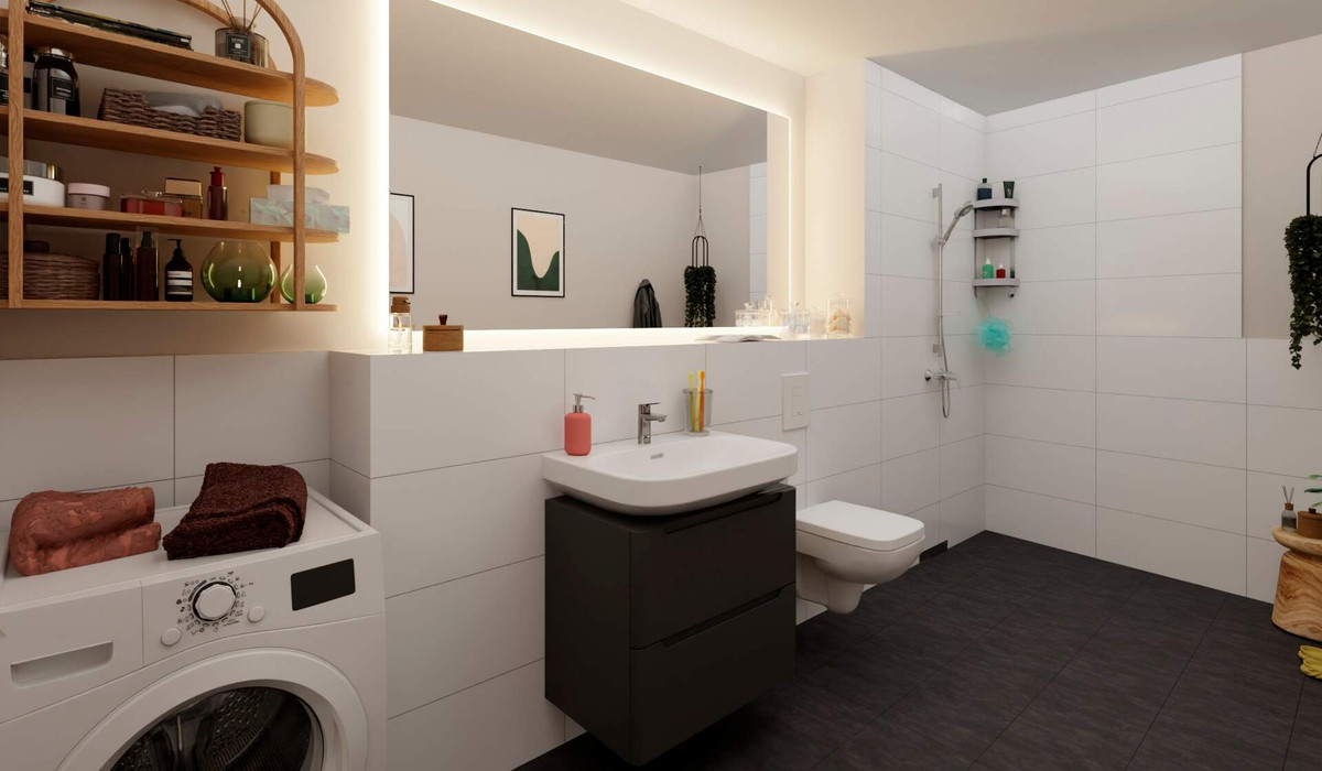 Sie betreten die Wohnung über den Flur, der nach links direkt in die offene Wohnküche führt. Hier können Sie Ihre Kochkünste entfalten und gemütliche Abende auf der Couch verbringen. Das Wohnzimmer bietet Zugang zur Terrasse und zum eigenen Garten, ideal für entspannte Stunden im Freien. Das Badezimmer mit bodengleicher Dusche ist modern gestaltet und verfügt über stilvolle Armaturen. Zwei weitere Zimmer stehen Ihnen zur Verfügung: Ein Schlafzimmer für erholsame Nächte und ein weiteres Zimmer, das sich hervorragend als Büro, Kinder- oder Gästezimmer eignet. Stauraum und Abstellmöglichkeiten bietet der Keller, der zur Wohnung dazu gehört.