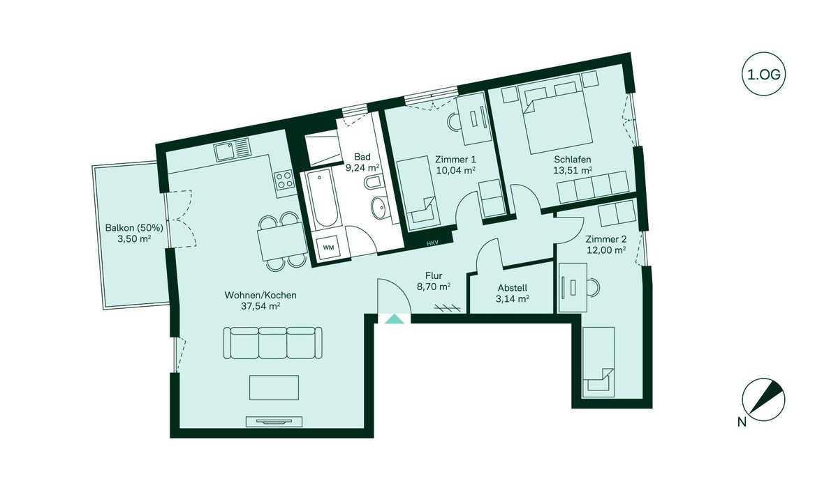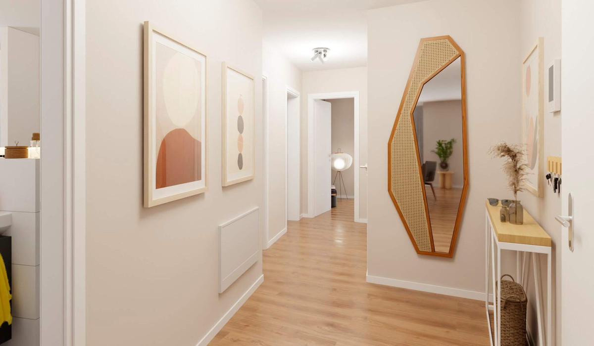 Willkommen in Ihrer neuen Wohnung im ersten Obergeschoss: Der Flur bietet Platz für eine Garderobe und führt Sie direkt in den großzügigen Wohn- und Essbereich mit offener Küche. Von hier aus gelangen Sie auf den Balkon, perfekt für entspannte Stunden an der frischen Luft. Drei Schlafzimmer bieten Platz für Familie, Gäste oder Homeoffice und das moderne Tageslichtbad ist mit einer Badewanne sowie einer bodengleichen Dusche ausgestattet. Ein praktischer Abstellraum in der Wohnung sorgt für zusätzlichen Komfort und ergänzt den Stauraum im Keller.