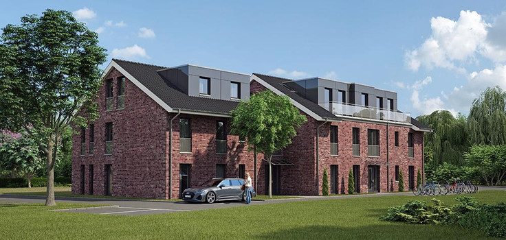 Unser neues Wohnquartier heißt Sie willkommen mit einem Gebäudeensemble aus fünf Häusern, direkt an einem parkähnlichen Friedhof und in rundum kleinstädtischer bis ländlicher Umgebung gelegen. Die Gebäude mit ihren ortstypischen Giebeldächern, überschaubaren acht bis 14 Wohnungen pro Haus und maximal zwei Geschossen plus Dachgeschoss fügen sich harmonisch in die Umgebung ein. Schöne Gärten mit Terrasse im Erdgeschoss/Untergeschoss, geräumige Balkone in den Obergeschossen, Tiefgaragenstellplätze (auch für E-Autos), eine große Grünfläche zum Spielen sowie Entspannen und Gärtnern auf der eigenen grünen Scholle sorgen für Wohlfühlwohnen im gesamten Quartier.