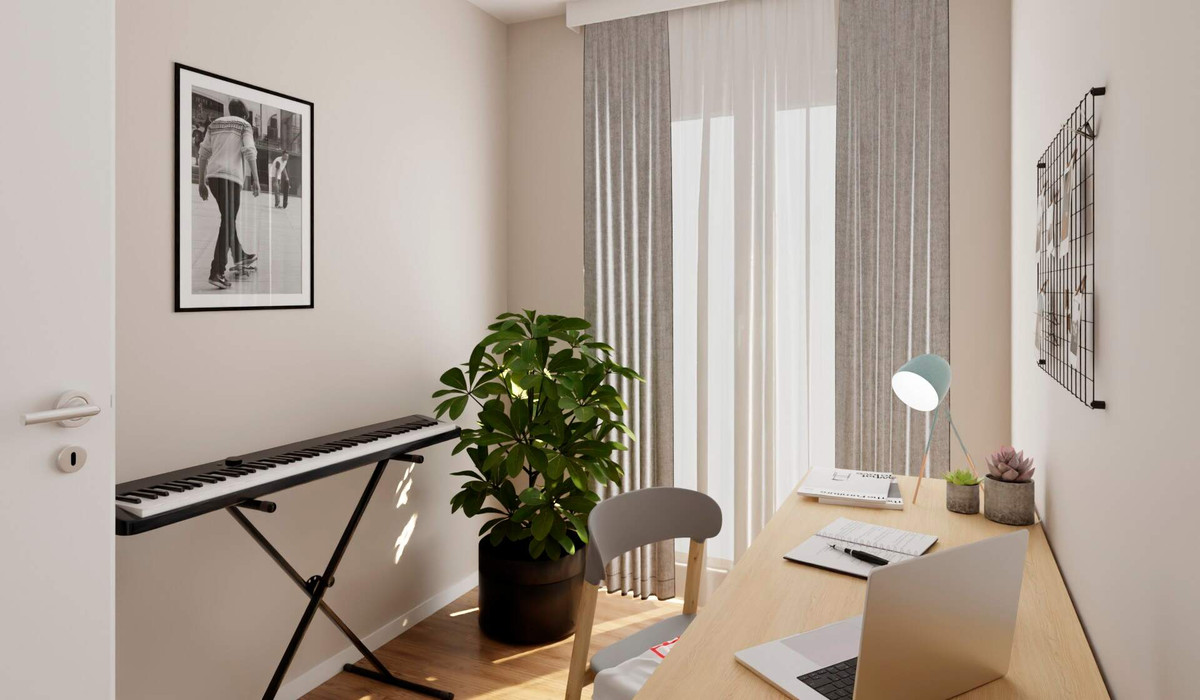 Das Schlafzimmer verspricht Ruhe und Komfort, während das Arbeitszimmer ideal für Home Office oder kreative Projekte geeignet ist. Ein weiteres Zimmer bietet flexible Nutzungsmöglichkeiten. Das Bad und der praktische Abstellraum sorgen für zusätzlichen Komfort und Stauraum.