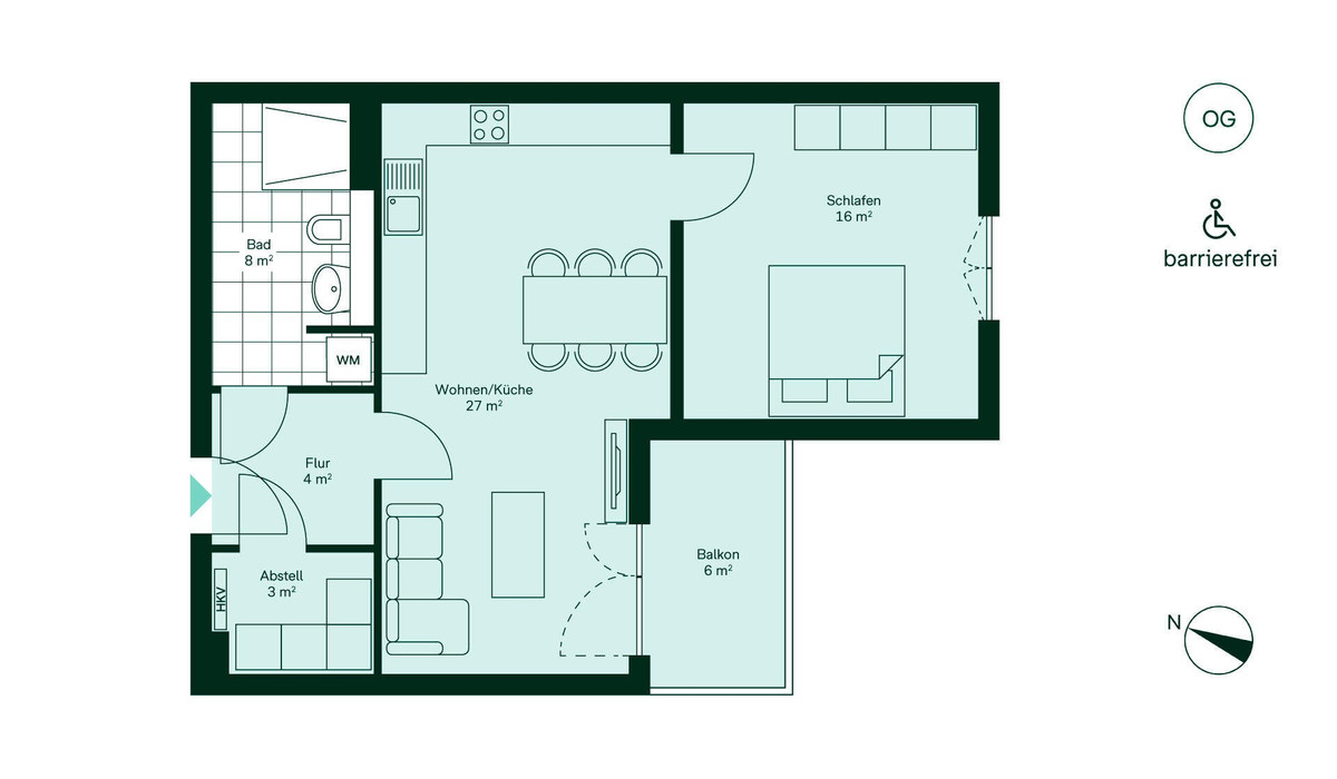 Treten Sie ein in Ihre neue Eigentumswohnung. Der Eingangsbereich führt Sie direkt in das gemütliche Wohnzimmer mit offener Küche. Hier können Sie Ihren Tag mit einem köstlichen Frühstück am Esstisch beginnen. Das Schlafzimmer bietet Ruhe und Platz für entspannte Nächte.