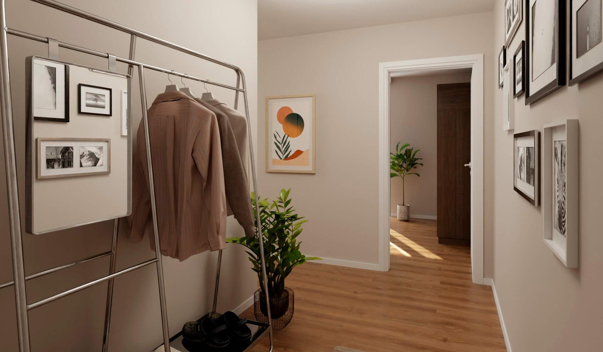 Willkommen in Ihrer neuen Wohnung auf der ersten Etage. Der einladende Flur führt Sie direkt in den großzügigen Wohnbereich, der mit einer offenen Küche kombiniert ist. Hier können Sie Ihre Kochkünste entfalten und den Tag entspannt ausklingen lassen. Zwei gemütliche Schlafzimmer bieten Raum für persönliche Gestaltung und erholsame Nächte.