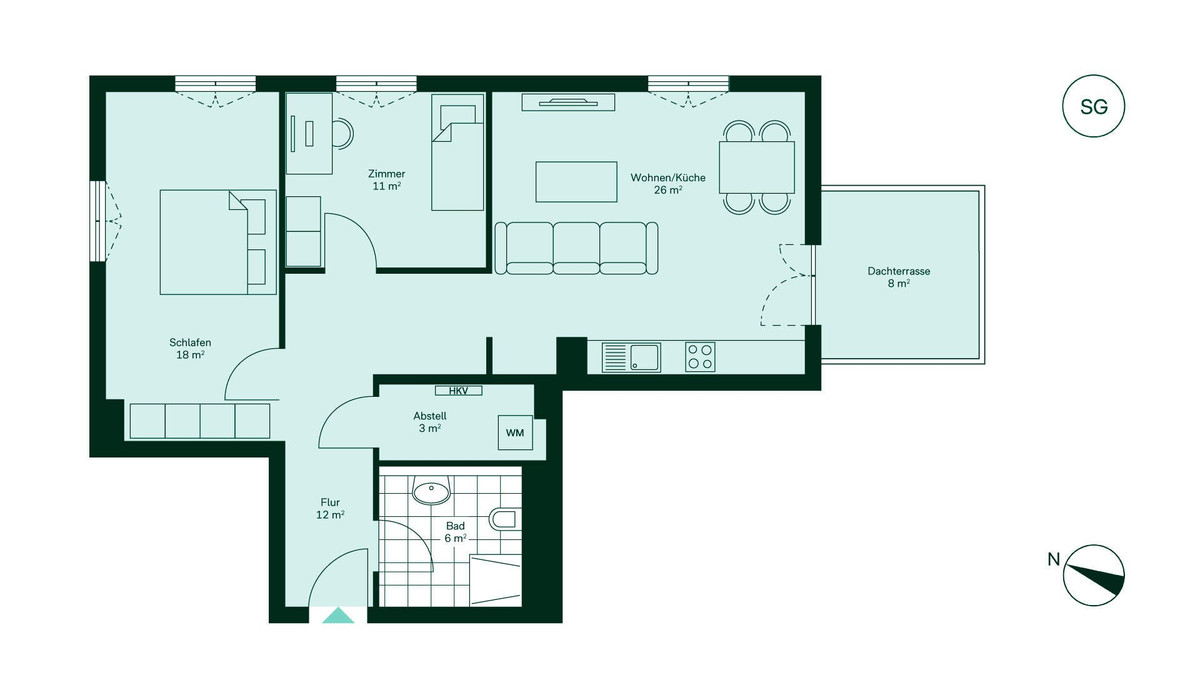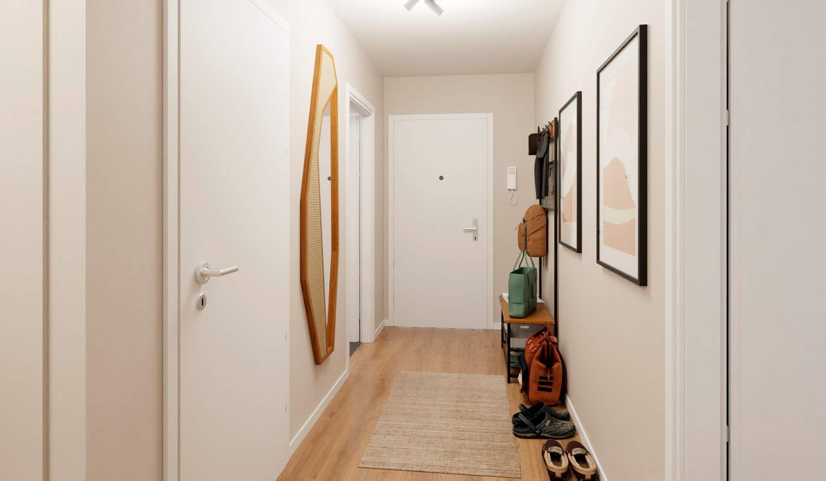 Treten Sie ein in Ihren neuen Wohntraum auf der zweiten Etage. Der Flur führt Sie direkt in das Herzstück der Wohnung: die offene Wohnküche. Hier können Sie beim Kochen den Blick auf die Dachterrasse genießen, die sich perfekt für entspannte Abende im Freien eignet. Das Wohnzimmer bietet ausreichend Platz für eine gemütliche Sofaecke.
