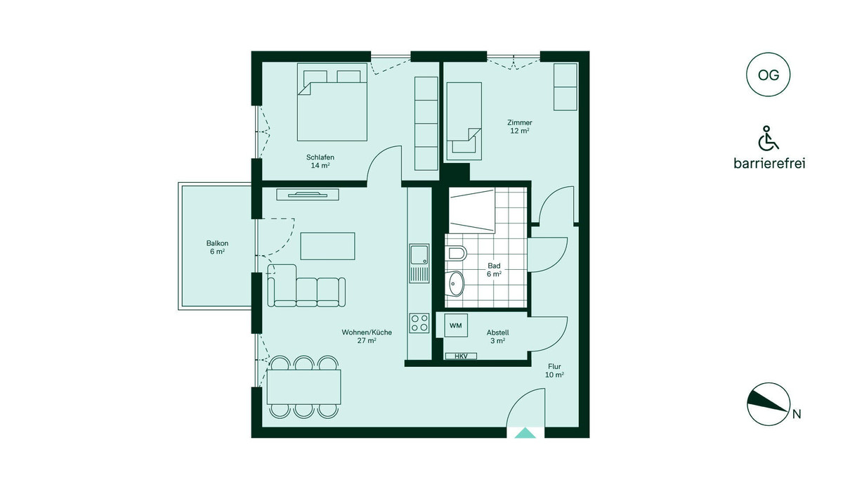 Willkommen in Ihrer neuen Wohnung. Der Eingangsbereich führt Sie direkt in den offenen Wohn- und Kochbereich, der zum Verweilen einlädt. Hier können Sie Ihre Kochkünste entfalten und entspannte Abende mit Freunden genießen. Das Wohnzimmer öffnet sich zu einem gemütlichen Balkon mit Südausrichtung, ideal um Sonne zu tanken. Zwei weitere Zimmer bieten Raum für Schlafzimmer oder als Homeoffice. Das Badezimmer ist praktisch gestaltet und mit einer bodengleichen 120 cm x 120 cm Dusche ausgestattet. In dem zusätzlichen Abstellraum, haben Sie Platz für alles was verstaut werden muss. Diese barrierefreie Wohnung kombiniert Komfort und Funktionalität.