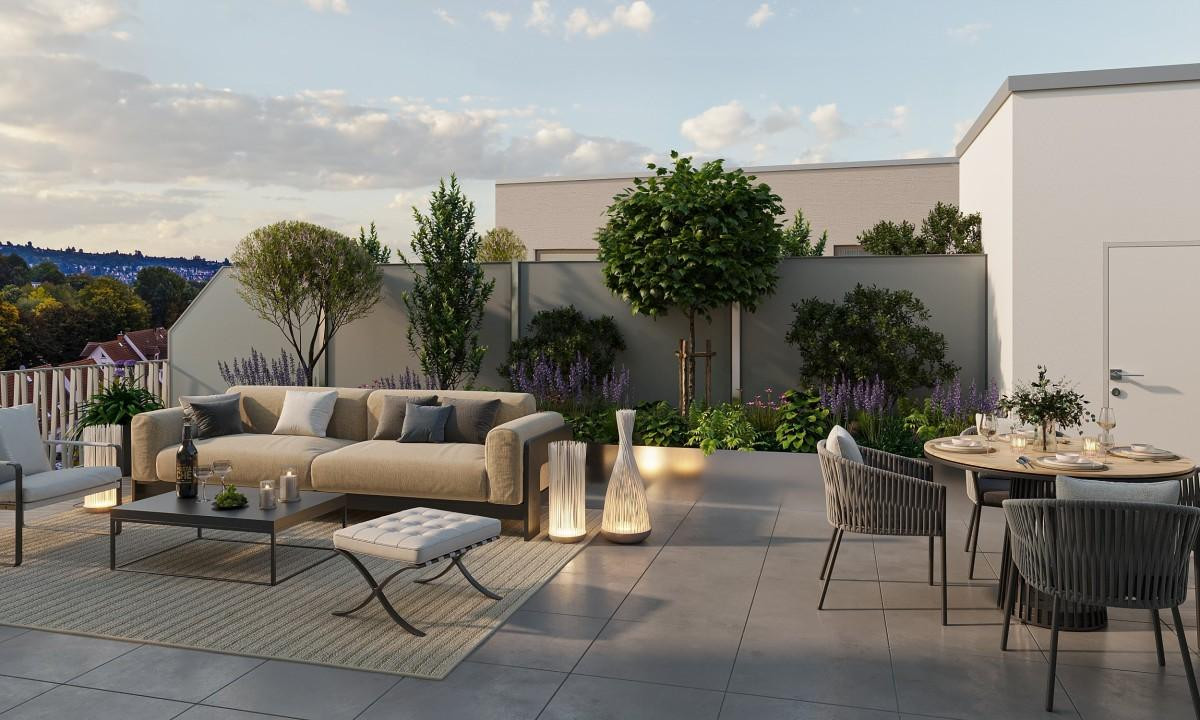 Von den spektakulären Penthäusern mit ihren ausladenden begrünten Dachterrassen kann der Blick ungestört über das Bad Vilbeler Umland schweifen.