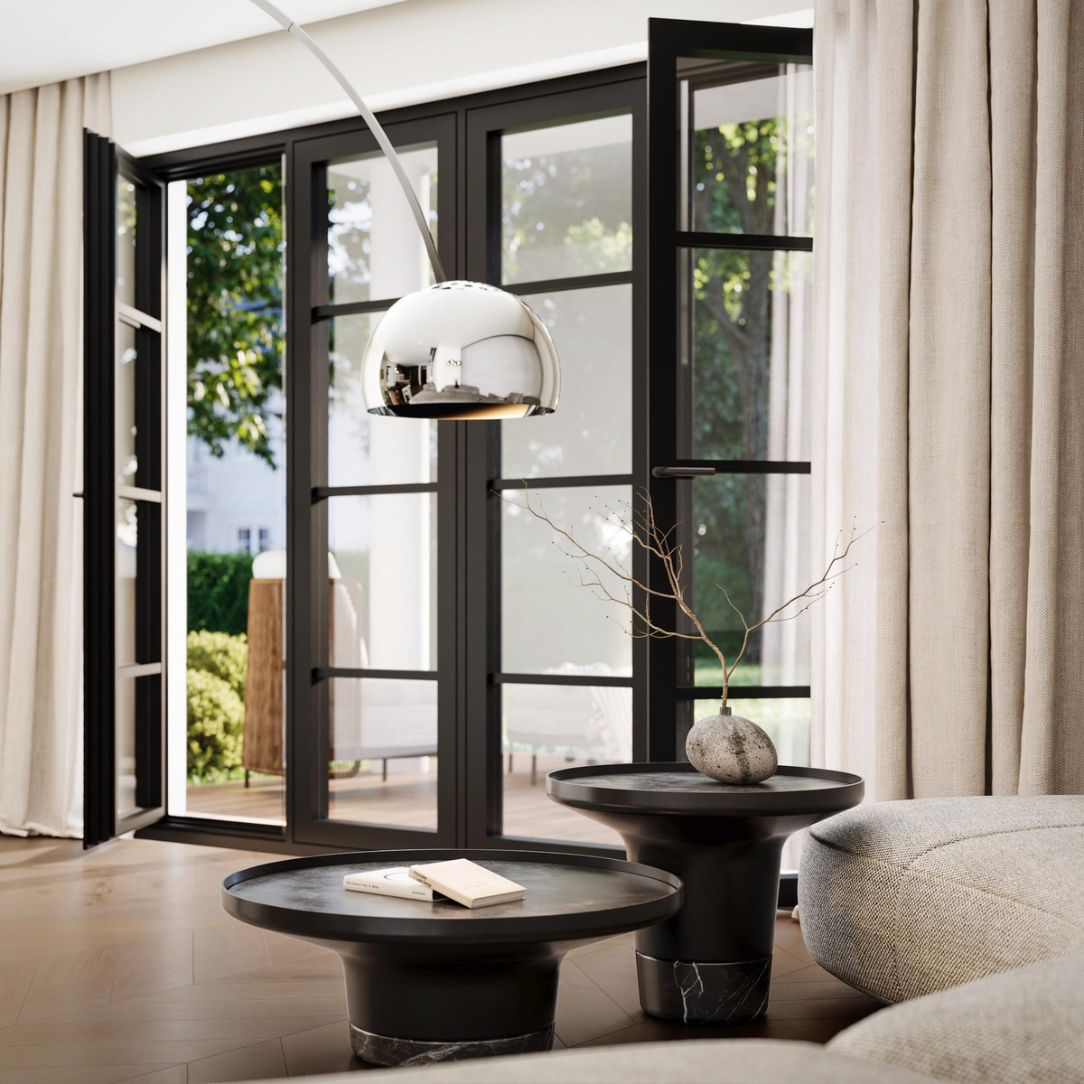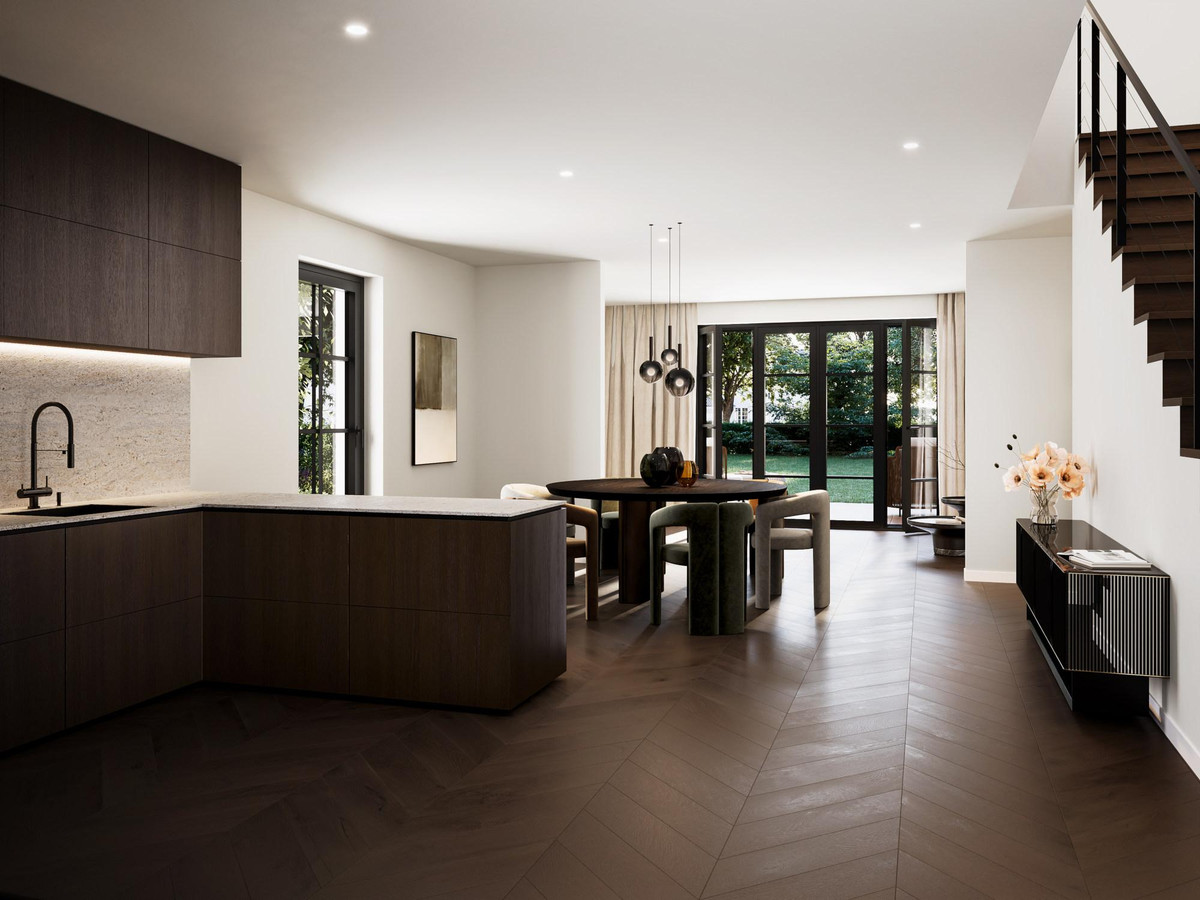 Jede Doppelhaushälfte erstreckt sich über vier Ebenen – inklusive voll nutzbarem Keller und einem ausgebauten Studio im Dachgeschoss. Bodentiefe Fenster im Wohnbereich, offene Küchenkonzepte und helle, lichtdurchflutete Räume schaffen eine freundliche, moderne Wohnatmosphäre mit hoher Aufenthaltsqualität. Die Ausstattung der Häuser erfüllt dabei hohe Ansprüche. Eine Luft-Wasser-Wärmepumpe in Kombination mit einer Fußbodenheizung mit Einzelraumsteuerung sorgt für effiziente und gleichmäßige Wärmeverteilung. Dreifachverglaste Fenster sichern eine hervorragende Energieeffizienz.