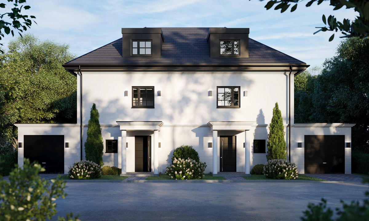 Zwei exklusive Doppelhaushälften entstehen in der Rabensteinstraße 26 im charmanten Münchner Stadtteil Aubing – einem gewachsenen Wohnviertel, das urbanes Leben mit naturnaher Umgebung harmonisch verbindet. Von außen überzeugt das Bauprojekt in der Rabensteinstraße 26 auf den ersten Blick durch seine moderne und gleichzeitig zurückhaltend-elegante Architektur. Die A&O Wohnbau GmbH realisiert hier zwei großzügige Doppelhaushälften mit durchdachten Raumkonzepten, klaren Linien und hochwertigen Materialien. Die Gestaltung fügt sich harmonisch in das bestehende Wohnumfeld ein – mit schwarzen Fensterrahmen, großflächigen Fensterelementen und einer fein abgestimmten Fassadengestaltung.