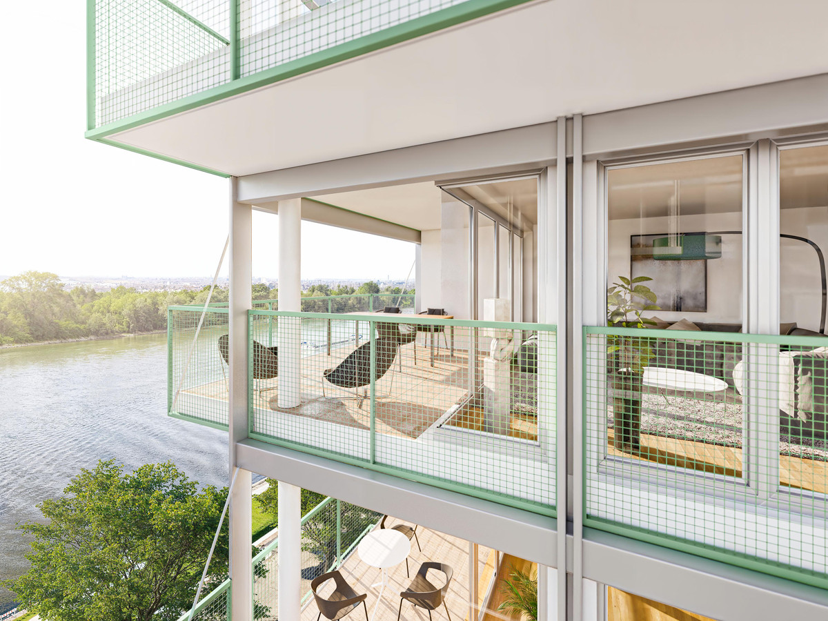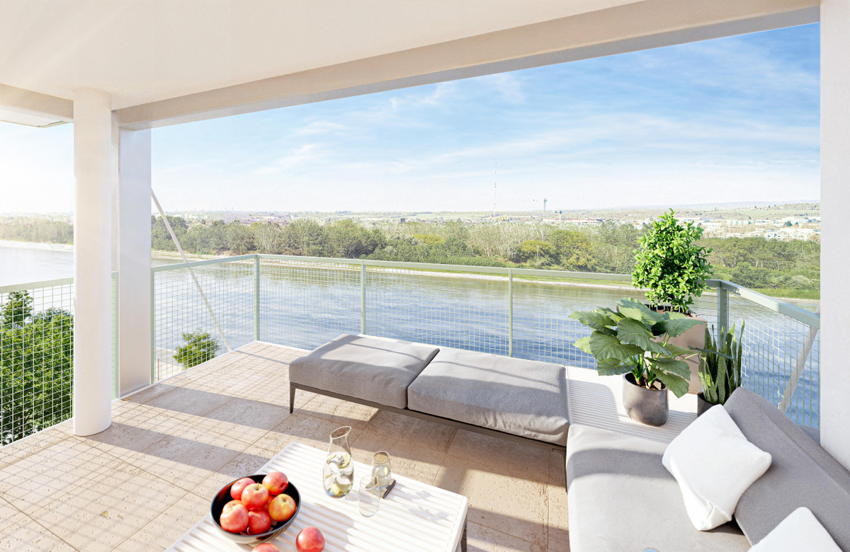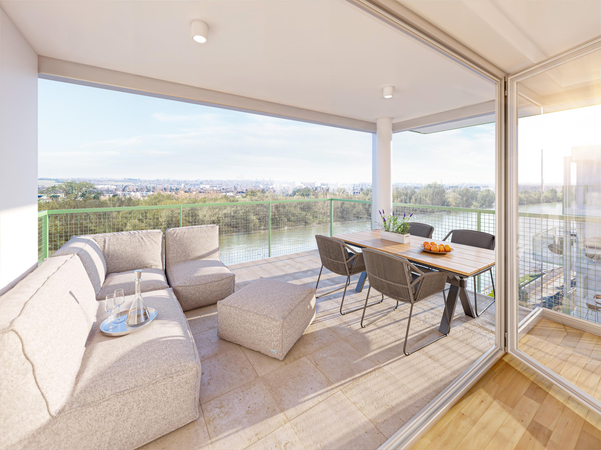 Den Ausblick auf die Flusslandschaft genießen und die Wärme der aufgehenden Sonne im Gesicht spüren – RHEINWIESEN living macht es möglich. Alle Wohnräume, Balkone und Loggien sind ideal auf den Fluss ausgerichtet und bieten einen unverbaubaren Blick auf das Rheinpanorama. Hier wird Wohnen in der ersten Reihe wahr.