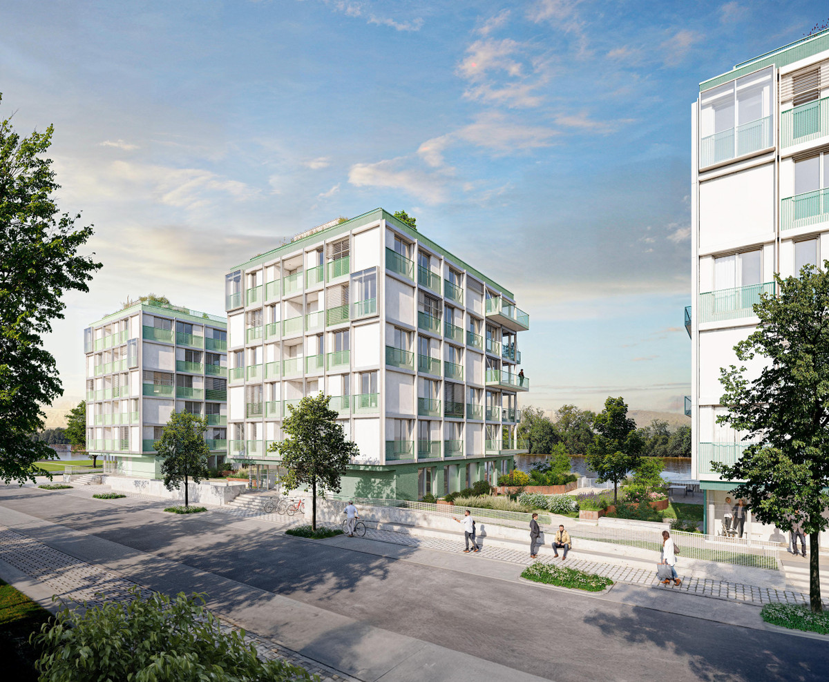 In erster Reihe zum frisch begrünten Rheinufer gelegen, bieten die Häuser auf einem leicht erhöhten Plateau sowohl herrliche Ausblicke als auch Privatsphäre. Stimmig gestaltete Freibereiche, von privaten Gärten bis zu gemeinschaftlichen Grünflächen, machen RHEINWIESEN living zu einem rundum gelungenen Wohnensemble.