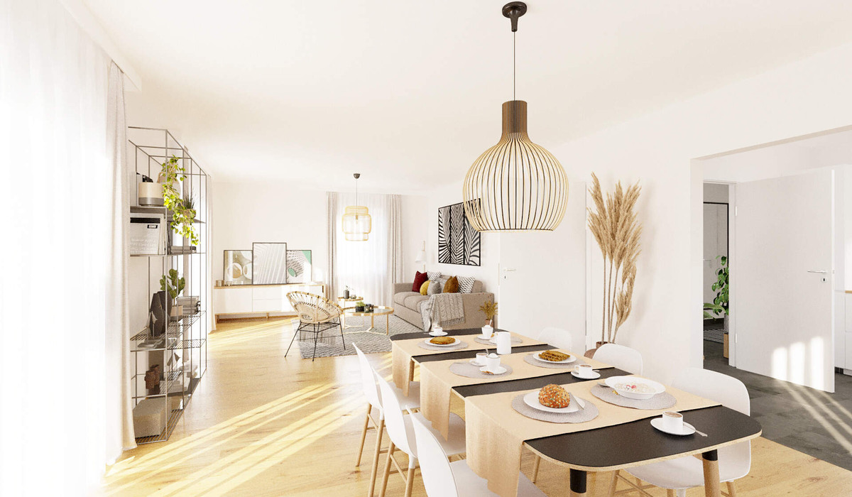 Im Erdgeschoss erwartet Sie ein offener Wohn- und Essbereich mit direktem Zugang zur Terrasse – ideal für Familienmahlzeiten drinnen wie draußen. Die gut integrierte Küche, ein separates Gäste-WC und der praktische Hauswirtschaftsraum sorgen für einen reibungslosen Alltag. Die großzügige Terrasse lädt dazu ein, draußen Zeit miteinander zu verbringen – ob beim Frühstück oder an langen Sommerabenden.