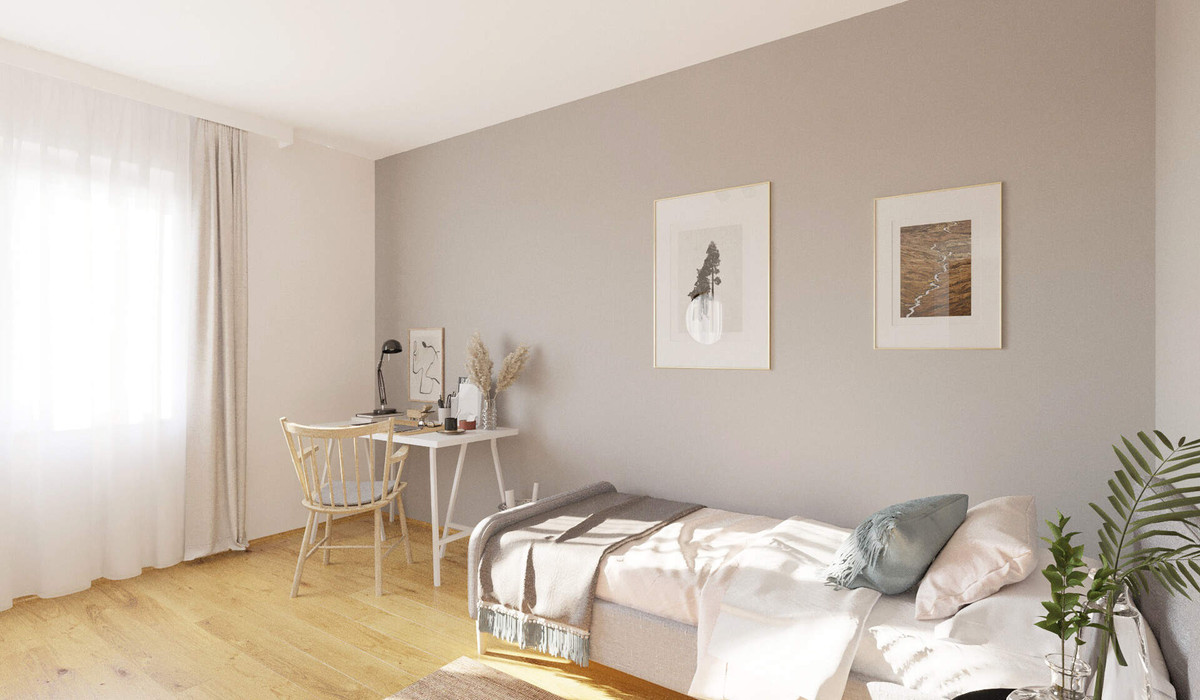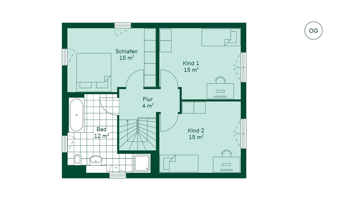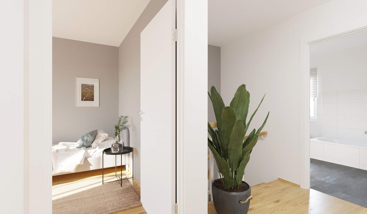 Im Obergeschoss befinden sich drei nahezu gleich große Zimmer, die flexibel nutzbar sind – als Kinderzimmer, Schlafzimmer oder Arbeitsbereich. Das helle Tageslichtbad bietet mit Dusche und Badewanne ausreichend Platz für das morgendliche Miteinander. Für ein angenehmes Wohngefühl sorgt die moderne Fußbodenheizung – auch an kühleren Tagen.