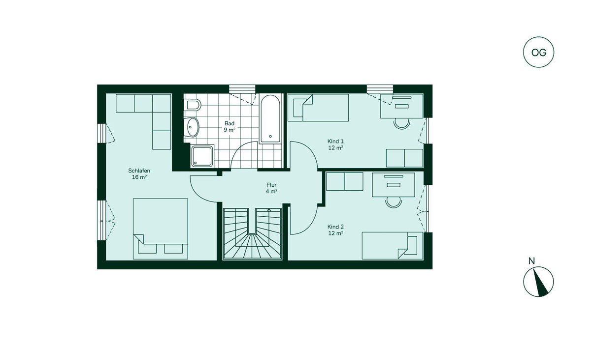 Im Erdgeschoss empfängt Sie eine großzügige Diele, die direkt in den offenen Wohn- und Essbereich führt. Die Küche ist funktional geschnitten und gut integriert – ideal für gemeinsames Kochen im Alltag. Durch die bodentiefen Fenster gelangt viel Licht ins Haus, und über den Wohnbereich erreichen Sie die Terrasse mit rund zwölf Quadratmetern Fläche – ein schöner Ort für Familienfrühstück oder entspannte Nachmittage im Freien. Eine Fußbodenheizung sorgt an kühlen Tagen für angenehme Wärme.