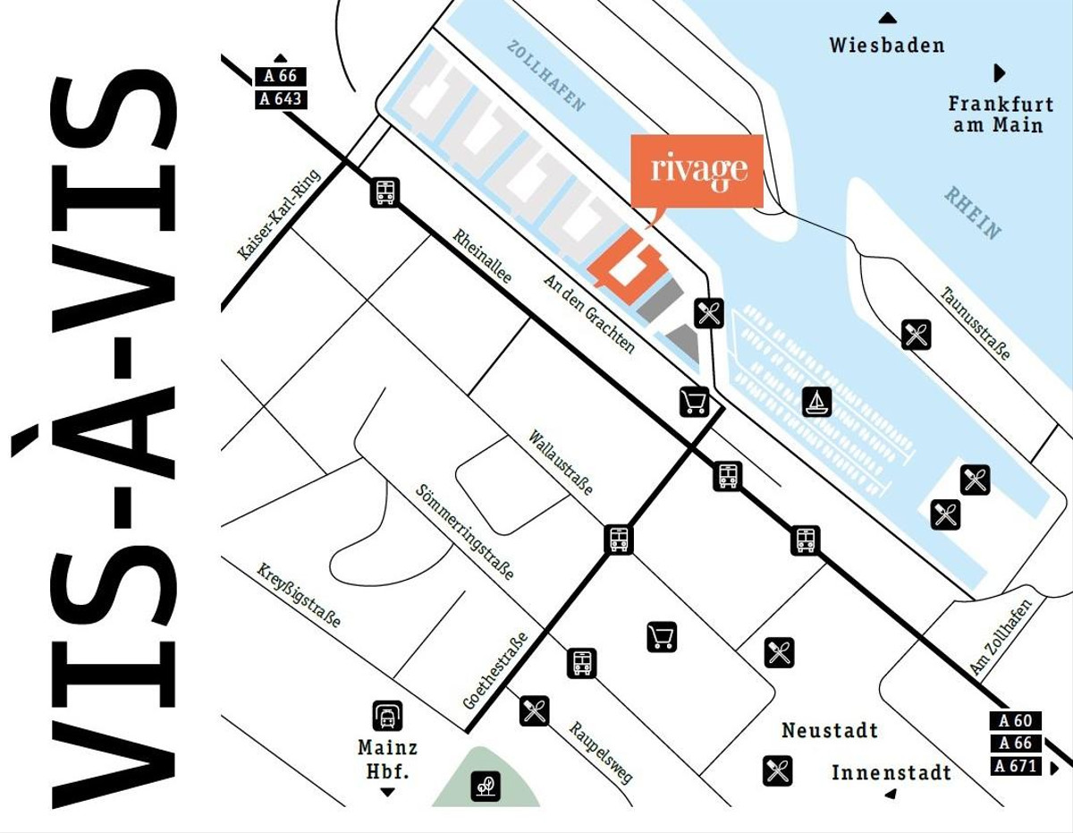 Das RIVAGE befindet sich in einer der attraktivsten Lagen von Mainz - zwischen Rhein und Grachten, zwischen Naturidyll und nachbarschaftlichen Höfen liegt Ihre Oase. Getreu der Weisheit: Zuhause ist, wo es am schönsten ist.