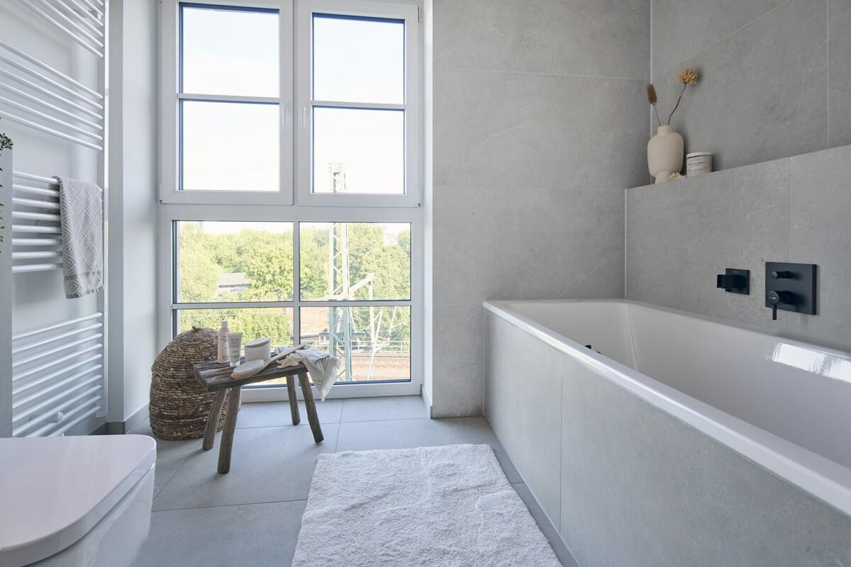 - Vollbad mit bodengleicher Rainshower-Dusche, Badewanne und Fenster