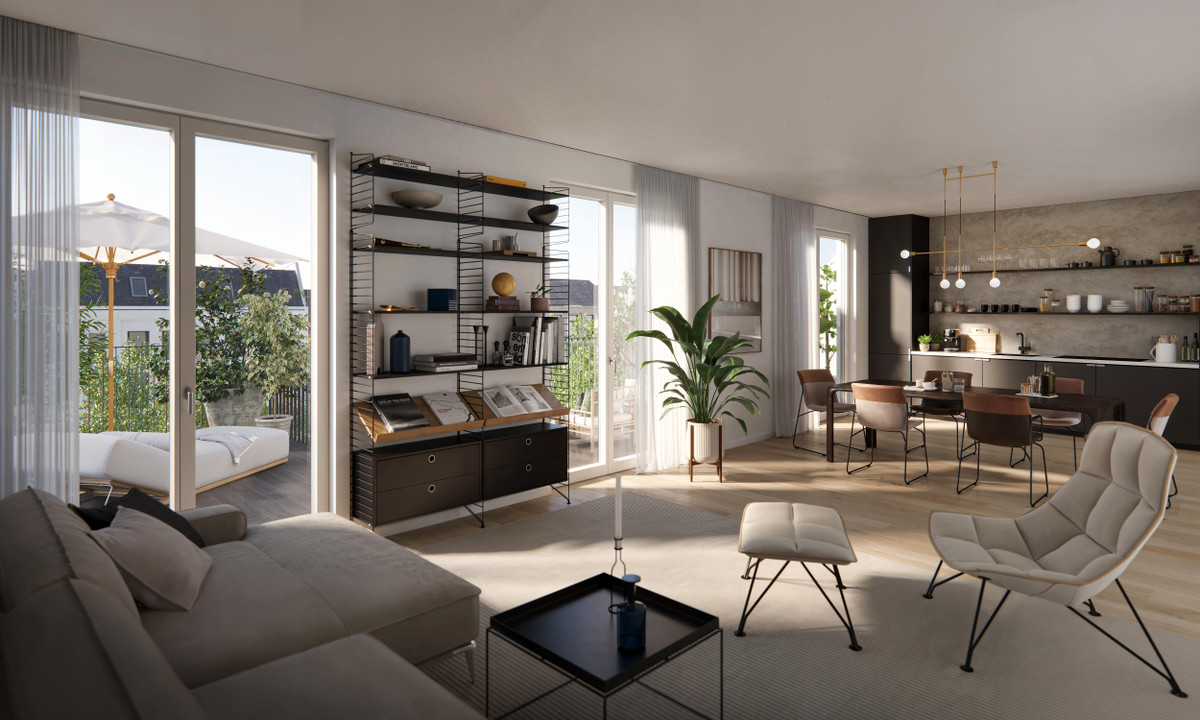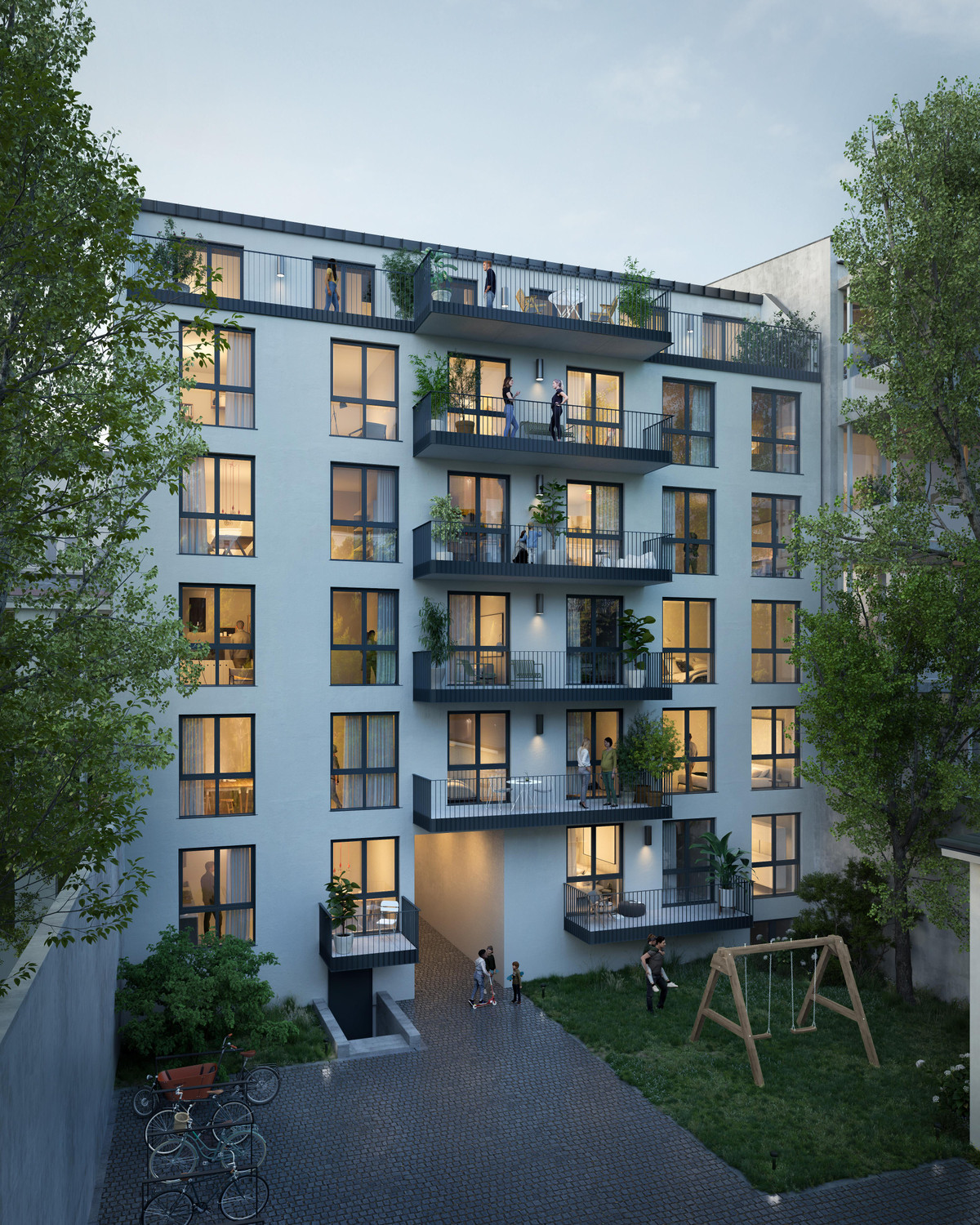 Von der verputzten Fassade über bodentiefe Fenster, die alle Wohnungen mit Licht fluten, bis hin zu großzügigen Balkonen, die zur eigenen privaten Ruhe-Oase im Trubel des Szeneviertels werden.