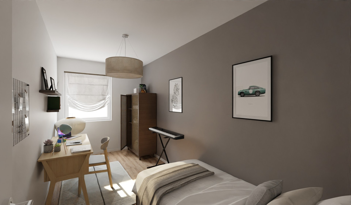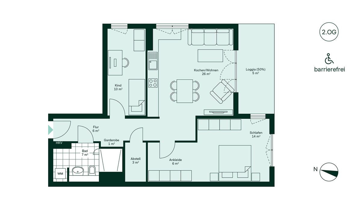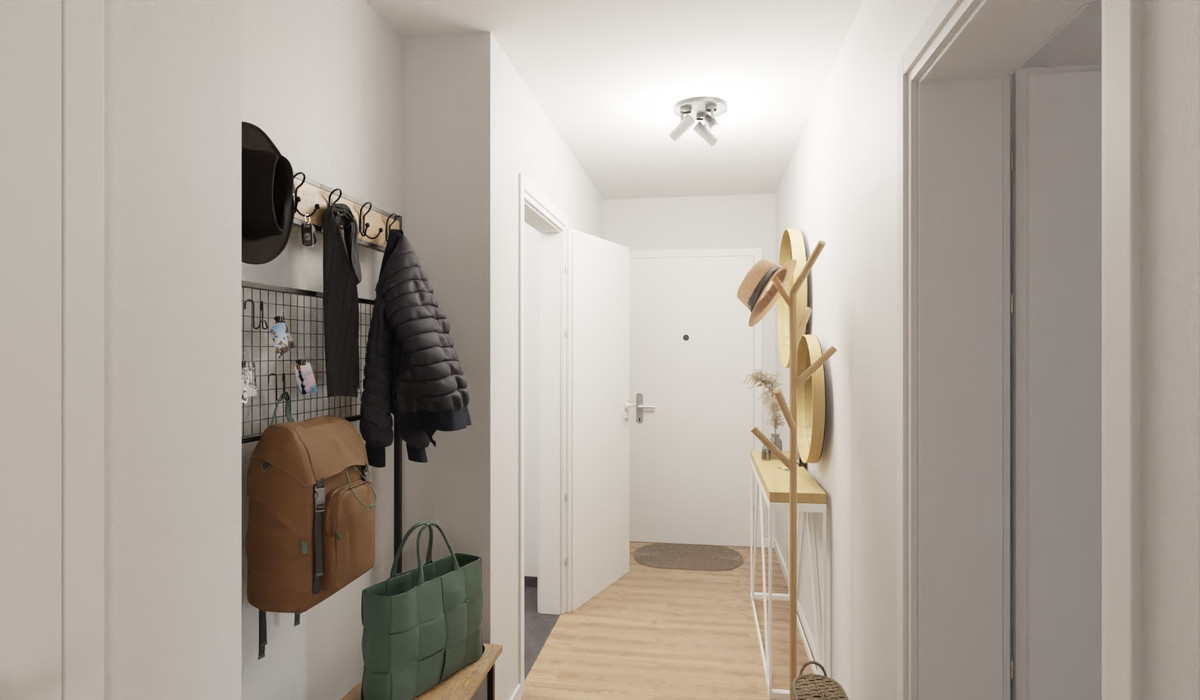Diese Wohnung im zweiten Obergeschoss bietet Ihnen ein sicheres Zuhause zum Ankommen, Wohlfühlen und Gestalten. Der durchdachte Grundriss eignet sich ideal für Paare, die gemeinsam leben – und dennoch Wert auf Rückzugsmöglichkeiten legen. Im Mittelpunkt steht der großzügige Wohnbereich mit rund 26 Quadratmetern, in dem Kochen, Essen und Entspannen ineinander übergehen. Die große Fensterfront sorgt für viel Tageslicht. Der direkte Zugang zur Loggia erweitert den Raum nach draußen – ideal für den ersten Kaffee am Morgen. Über die Ankleide gelangen Sie ins Schlafzimmer. Hier finden Sie nicht nur Platz für Ihr Doppelbett, sondern auch für Ihre Garderobe. Ein zusätzliches Zimmer mit etwa zehn Quadratmetern lässt sich flexibel nutzen: als Arbeitsbereich, Kinder- oder Gästezimmer oder für Ihre Hobbys. Das Bad ist mit einer bodengleichen Dusche ausgestattet. Im Flur sorgen ein Abstellraum und eine kleine Garderobennische für zusätzlichen Stauraum.