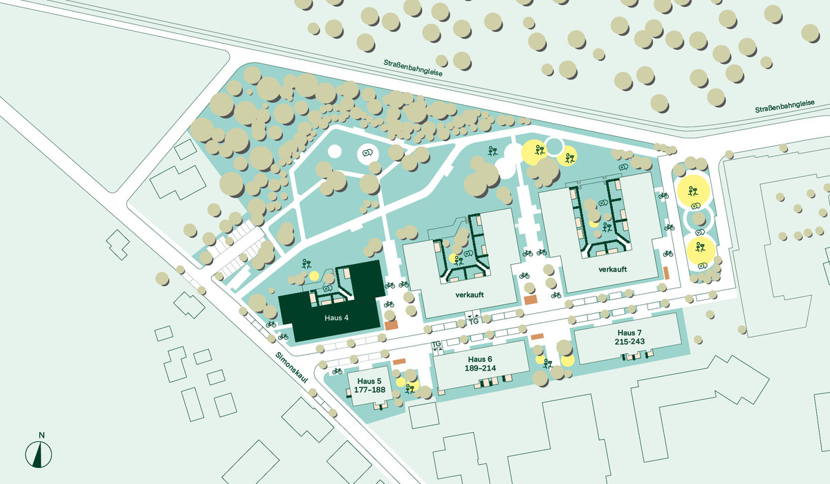 Das Neubauprojekt Simonsveedel ist besonders nachhaltig konzipiert und bietet unzählige Angebote für Spiel, Sport und Erholung auf Naturwiesen, im Park und den Aktivplätzen. Hunderte Fahrradstellplätze, eine Leihstation für Fahr- und Lastenräder sowie eine Carsharing-Station stehen zur Verfügung.