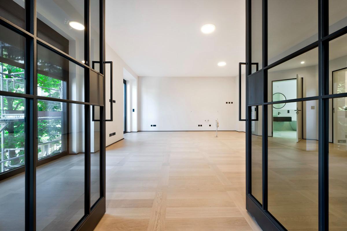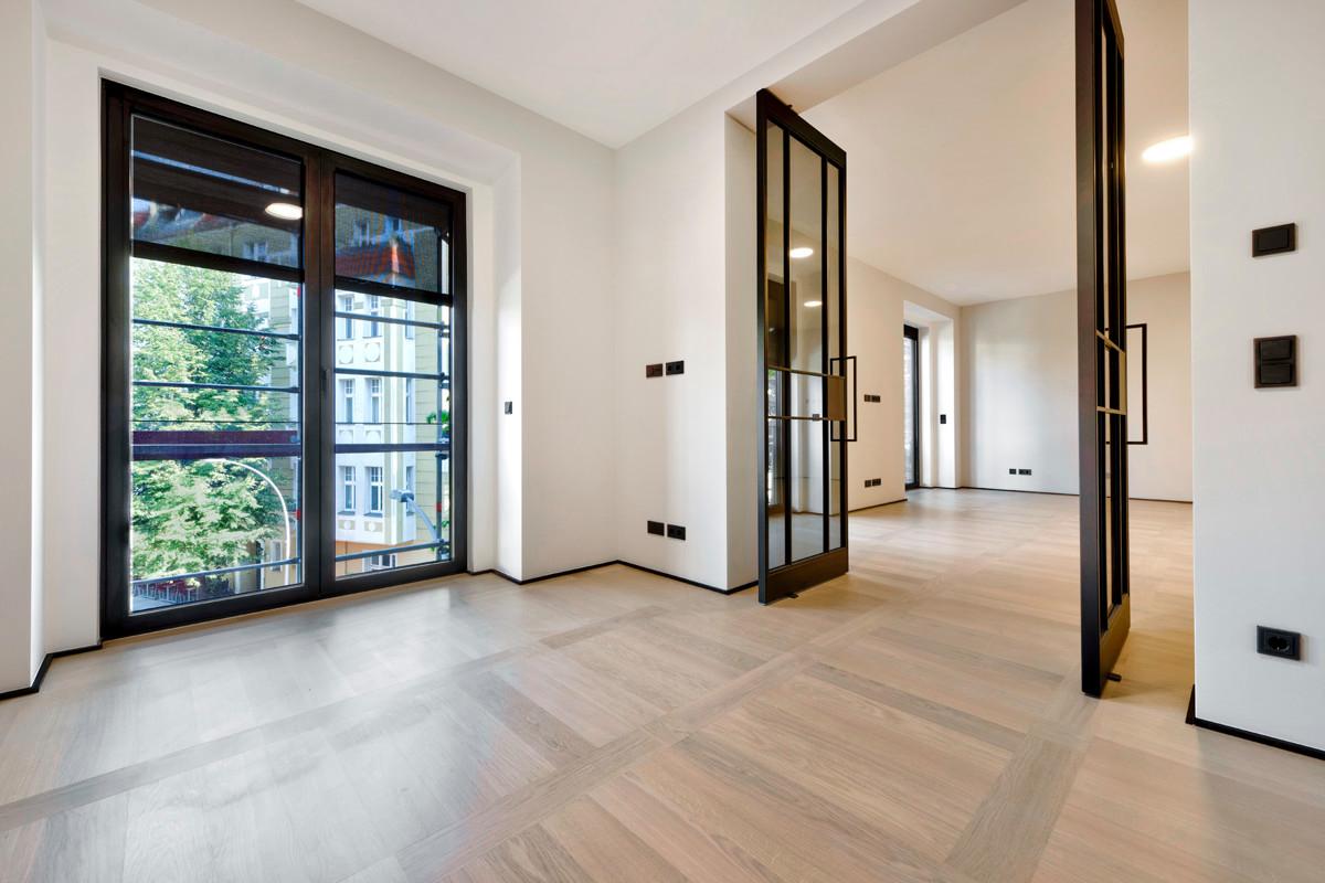Das markante Eckgebäude mit seinen eleganten Fenstern, Brüstungen und Details besteht aus einem Vorderhaus entlang der Simplonstraße mit zwei Treppenaufgängen und einem Vorderhaus, entlang der Dirschauer Straße, mit einem Treppenaufgang. In diesen 3 Treppenhäuser befinden sich auch die Aufzüge. Rückwärtig umschließen zwei Seitenflügel den gemeinschaftlichen Hof. Die landschaftsgärtnerisch gestaltete Anlage ist eine grüne Oase und rundet die perfekte Architektur ab. Townhouses, Ateliers, weitläufige Apartments und Penthouses garantieren erstklassigen Wohnkomfort. Hier verbindet sich das Beste aus zwei Welten: die Großzügigkeit der Gründerzeit und der Komfort eines Neubaus mit einer exklusiven Innenausstattung. Alle Apartments verfügen entweder über einen Balkon oder einen Balkon und eine Loggia. Die Penthouses besitzen Aufdachterrassen mit einem 360° Blick über die Hauptstadt. Fußbodenheizung, Echtholz-Parkett, Stuckverzierungen und eine moderne Gebäudetechnik schenken Ihnen exzellenten Komfort. Dazu gehören auch Fenster mit integrierten Sonnenschutzrollos und die Klingel- und Video-Gegensprechanlage. Alle Bäder erhalten eine handverlesene Premium-Ausstattung.