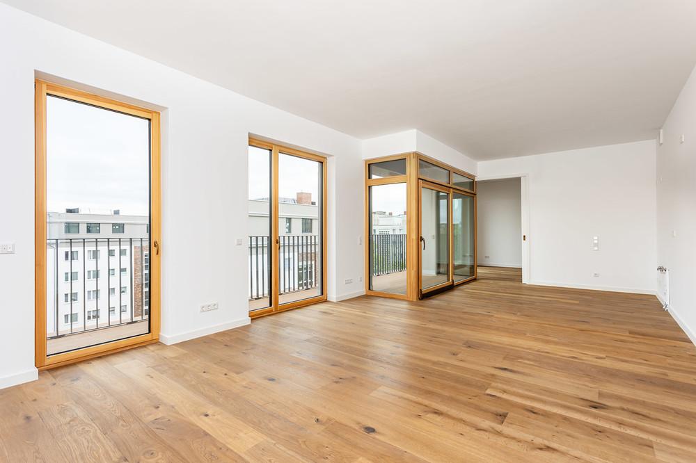 Alle Wohnungen besitzen sonnenverwöhnte Außenflächen mit traumhaftem Blick über Berlin: Loggien, umlaufende begehbare Balkone und Aufdachterrassen. Auch die Innenausstattung der Penthouse-Wohnungen entspricht diesem hohen Niveau. Hochwertige Holz-Aluminium-Isolierglas-Fenster und Echtholzparkett schaffen gekonnt einen eleganten Rahmen für Ihren persönlichen Einrichtungsstil.