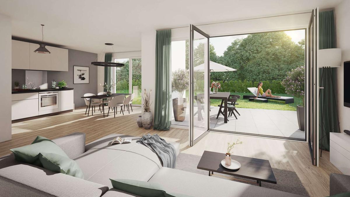 Sie gelangen über bodengleiche Fenstertüren von allen Wohnräumen in Ihren Garten. Der geräumige Wohn-, Ess- und Kochbereich ist lichtdurchflutet, denn er lässt bereits die Morgensonne in Ihre neue Wohnung.