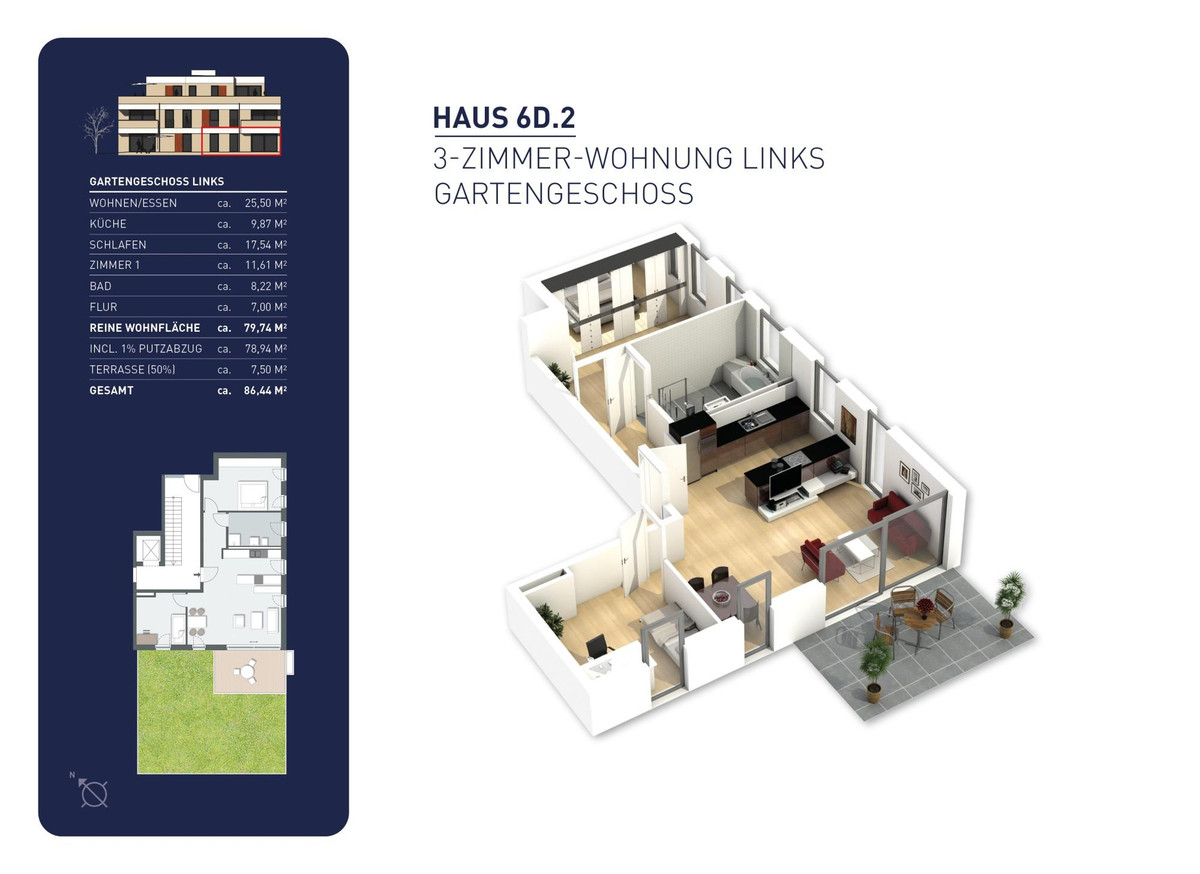 Eine attraktive Gartengeschoss Wohnung in einem kleinen Mehrfamilienhaus in grüner Lage. Die Wohnung verfügt über 3 Zimmern, eine Terrasse und eine Gartenfläche, die zum Entspannen und Wohlfühlen einladen. Die Wohnung hat 1 Schlafzimmer, 1 Büro/Hobbyraum/Kinderzimmer/Gästezimmer, ein Bad und eine moderne Wohnküche, die viel Platz für die Familie bietet. Die Gesamtfläche der Wohnung beträgt ca. 86,44 m².