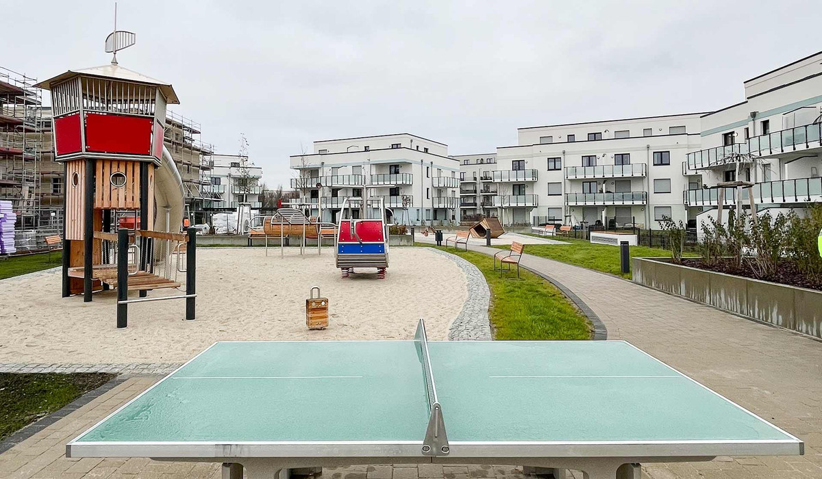 Grünes Wohnen am Rande der Großstadt: Auf den Grün- und Begegnungsflächen des Schönefelder Wohnquartiers lässt es sich herrlich mit den Nachbarn plaudern, während sich die Kinder auf den Spielplätzen bestens vergnügen. Autos parken in der Tiefgarage und Ihr Fahrrad steht sicher im Fahrradkeller.